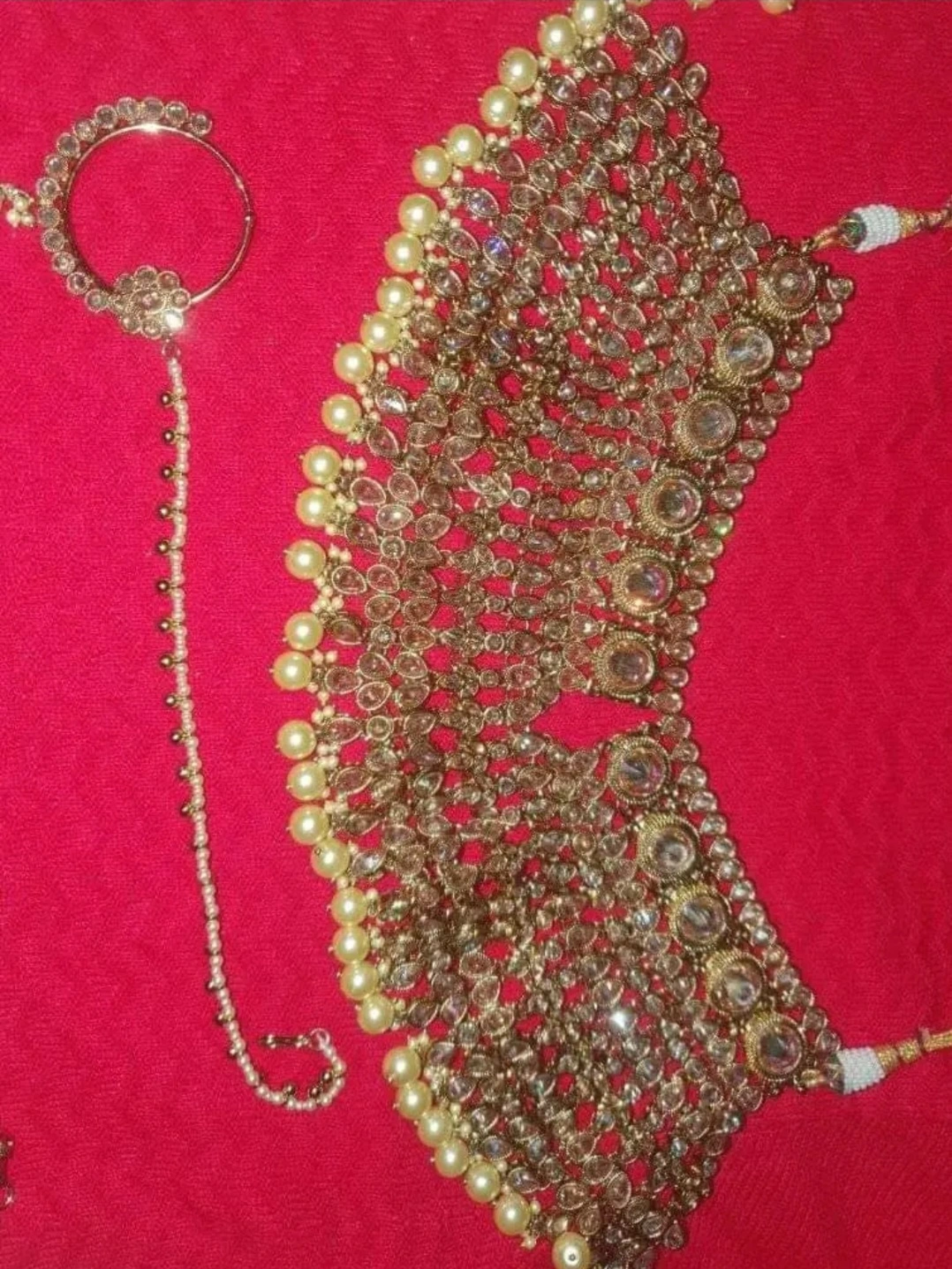 Stunning bridal jewellery set. Includes necklace, earrings, bangles, maang tikka, and more. Beautiful gold tone with sparkling stones. Perfect for weddings or special occasions.