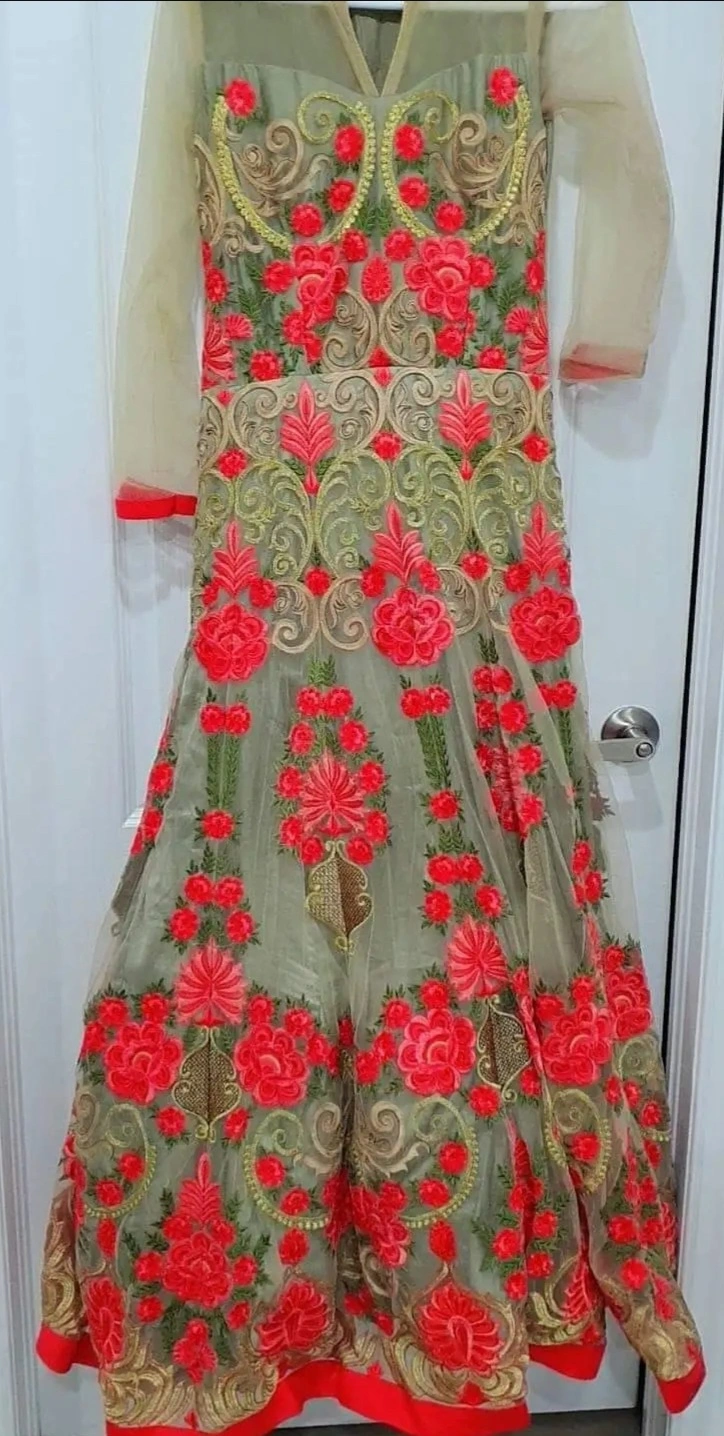 31Elegant embroidered gown. Features long sleeves and a high neck. Floral embroidery throughout. Light beige colour with red and gold accents. Floor-length. Great for special occasions. wear only one time