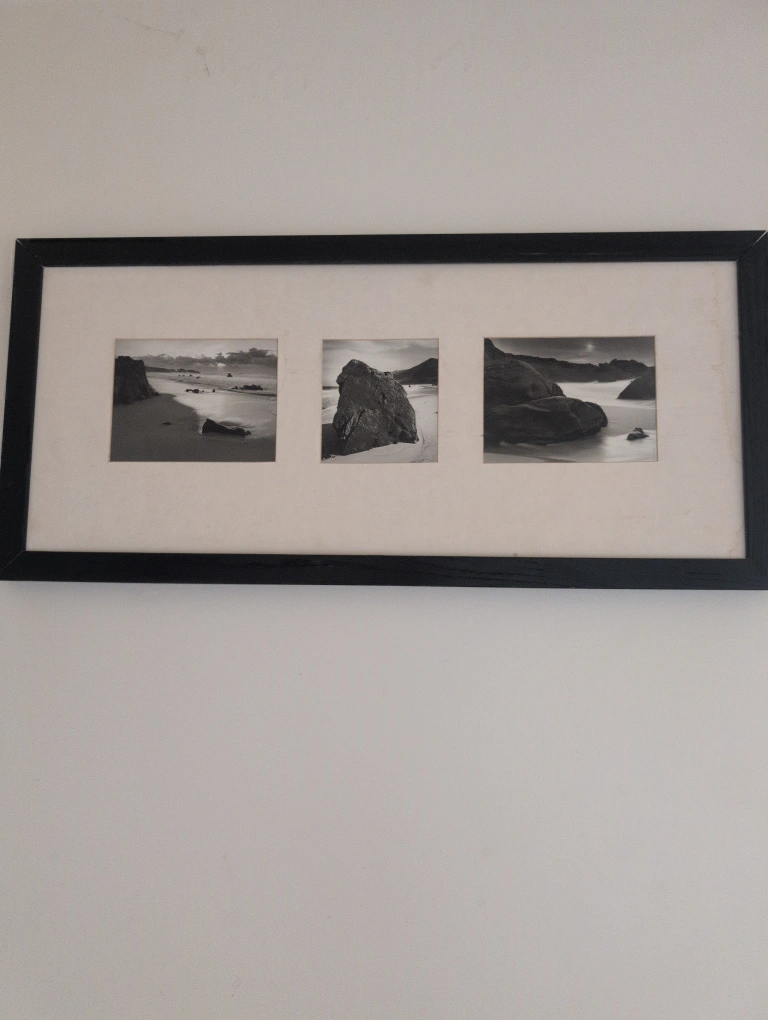 Black framed triptych. Three black and white coastal photos. Perfect for a beach house or modern decor.