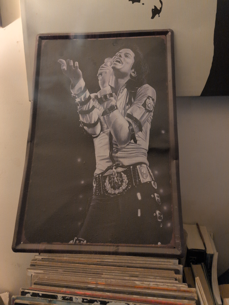Metal wall sign featuring a monochrome image of Michael Jackson performing. Great for music fans or collectors. Shows some minor wear.