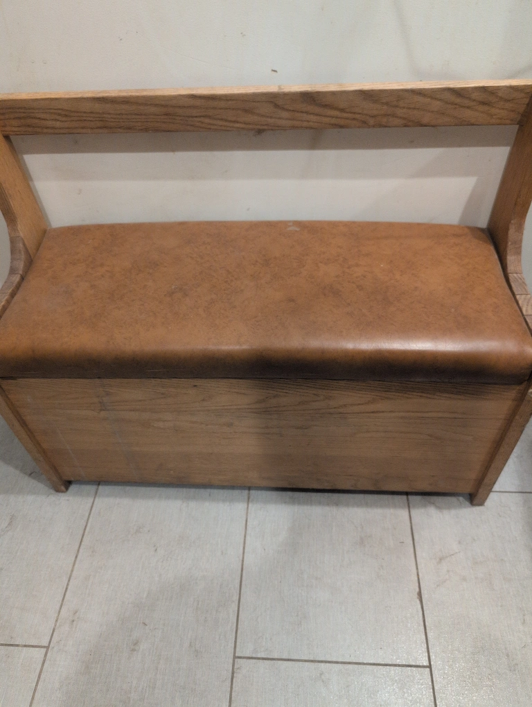 Wooden bench with storage. Features a tan leatherette seat and a simple, sturdy design. Perfect for entryway or bedroom.