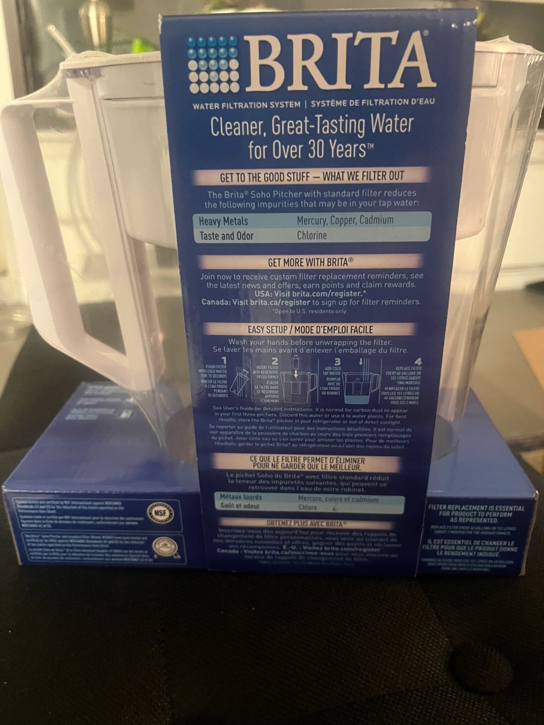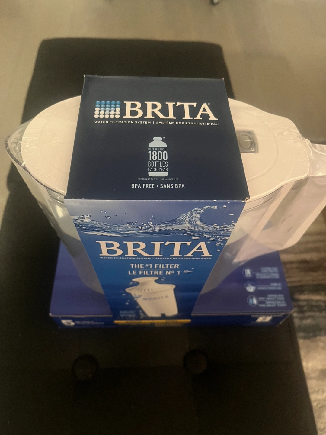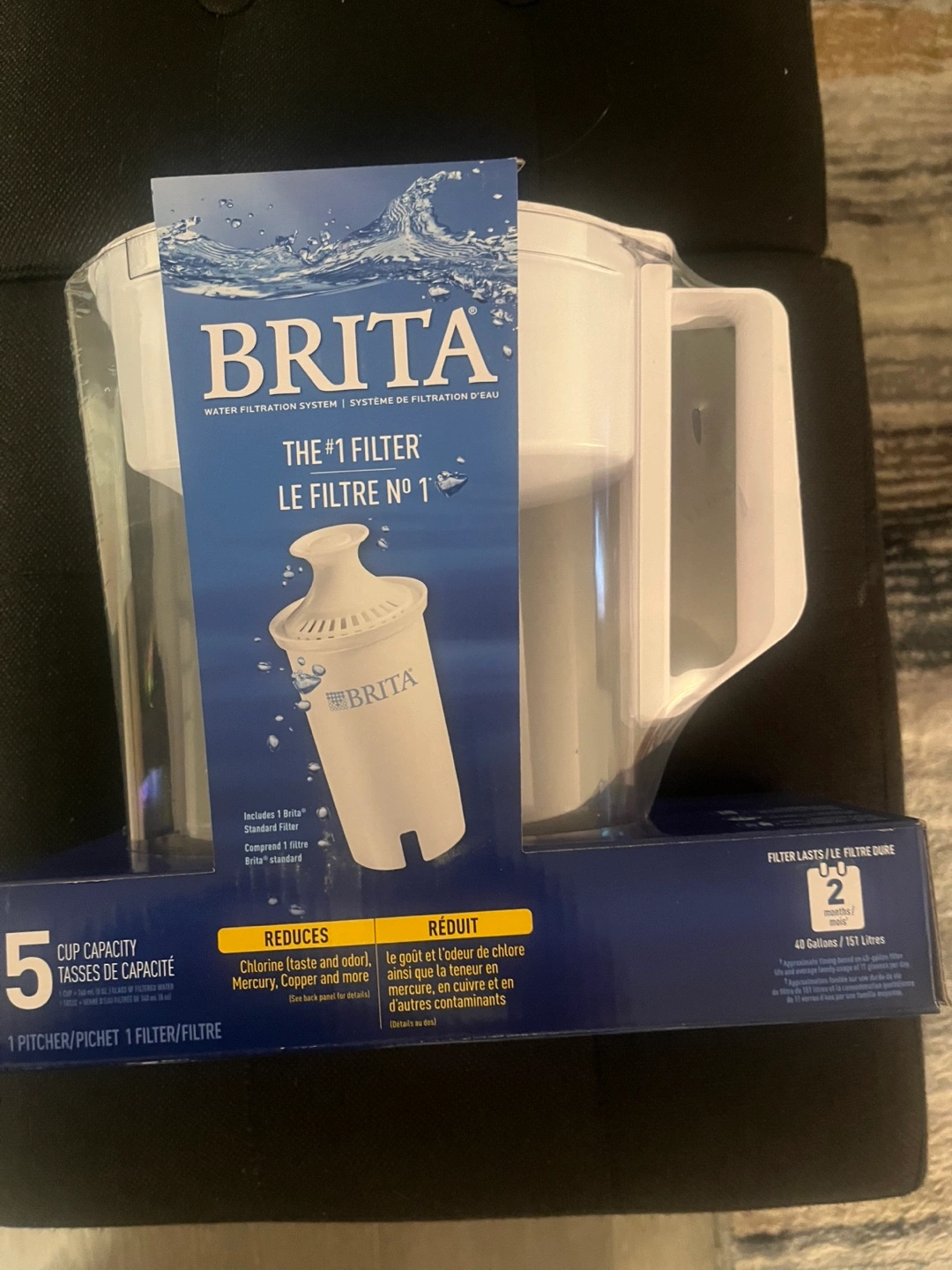 1000+New Brita filtered water pitcher, 5 cup capacity. Includes one filter. Unopened/in packaging. Available for pickup in Markland Wood.