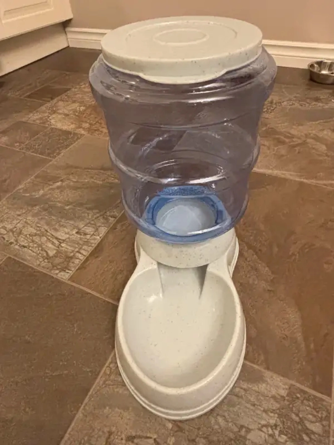 Gently used pet feeder. Six-pound (1.5-2kg) capacity. Features large, clear food canister and a speckled, off-white bowl. Easy to clean and refill. No cracks, breaks, or scratches.