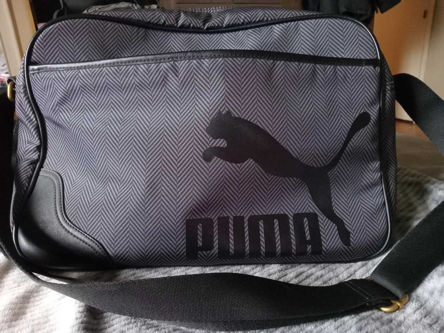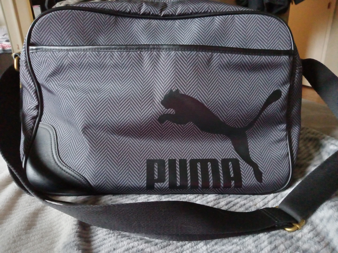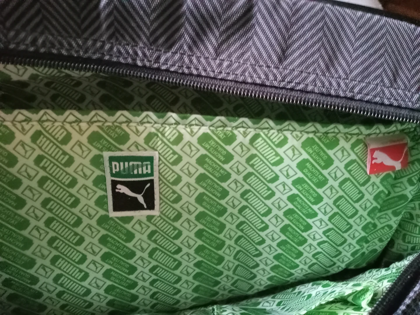 PUMA. Black/gray patterned bag. Leather corner and seams are perfect. One large zip pocket on exterior .Double zipper closure. Really nice "Kelly Green" and light gray, patterned interior lining. one large envelope style pocket and two smaller pockets inside. The strap is adjustable. 90% Poly and 10%PU. The PUMA Logo is perfect as well as the lining, pockets, zippers, material and bottom. 15"W x 11"H x 5.25"D. Just a great bag! Reduced from $25!!!