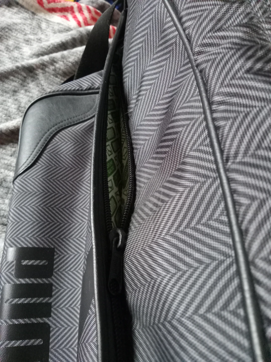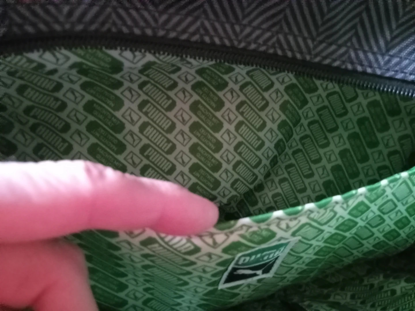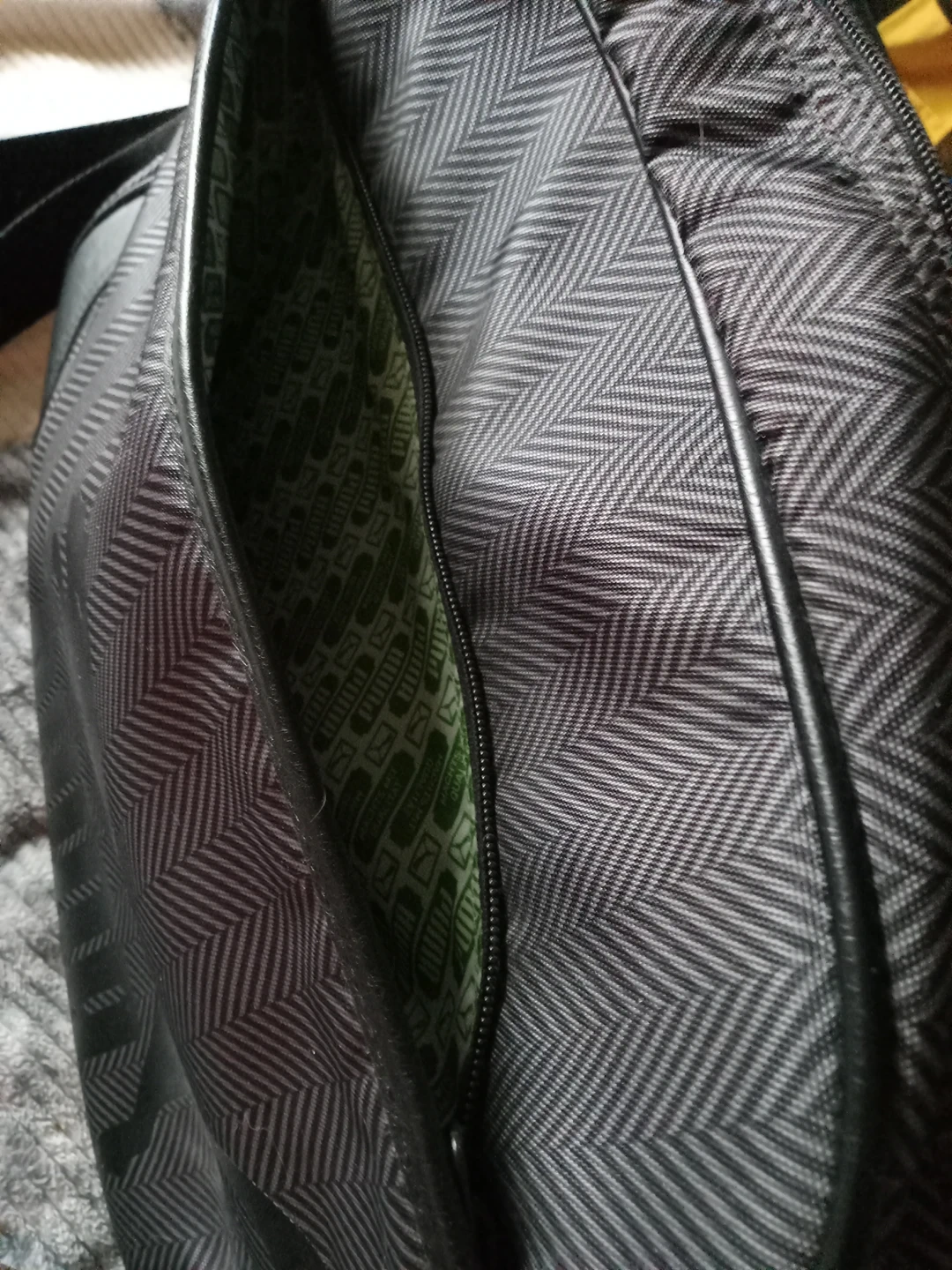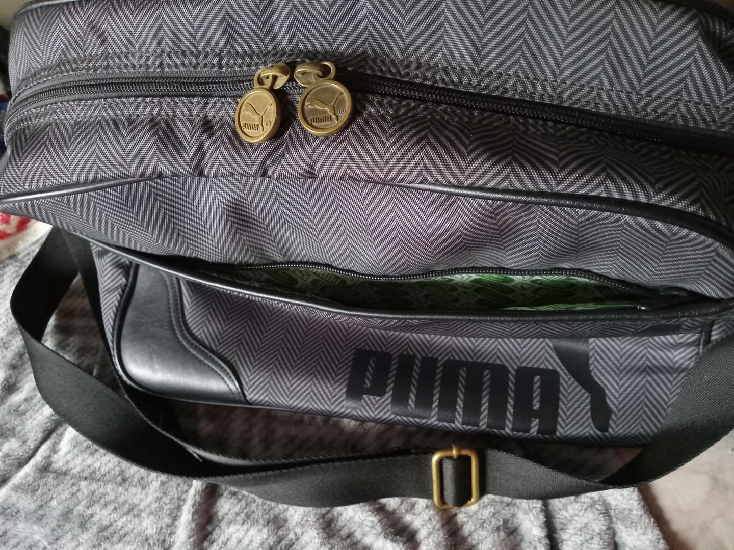 PUMA. Black/gray patterned bag. Leather corner and seams are perfect. One large zip pocket on exterior .Double zipper closure. Really nice "Kelly Green" and light gray, patterned interior lining. one large envelope style pocket and two smaller pockets inside. The strap is adjustable. 90% Poly and 10%PU. The PUMA Logo is perfect as well as the lining, pockets, zippers, material and bottom. 15"W x 11"H x 5.25"D. Just a great bag! Reduced from $25!!!