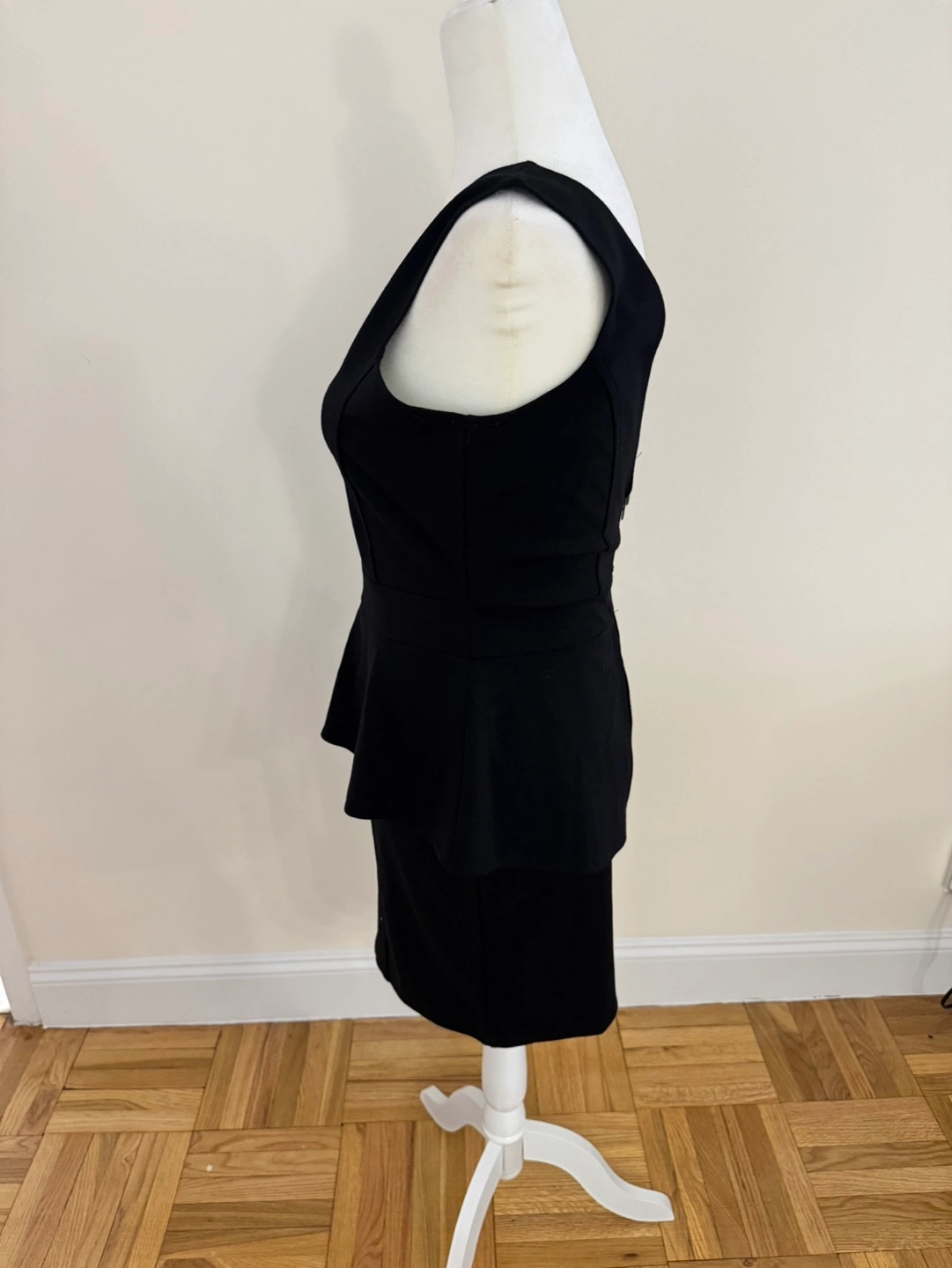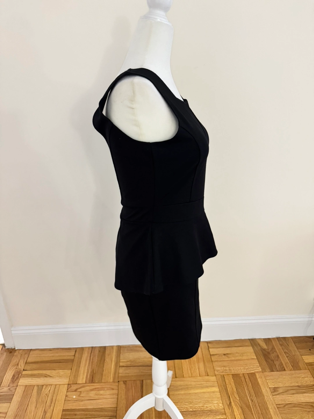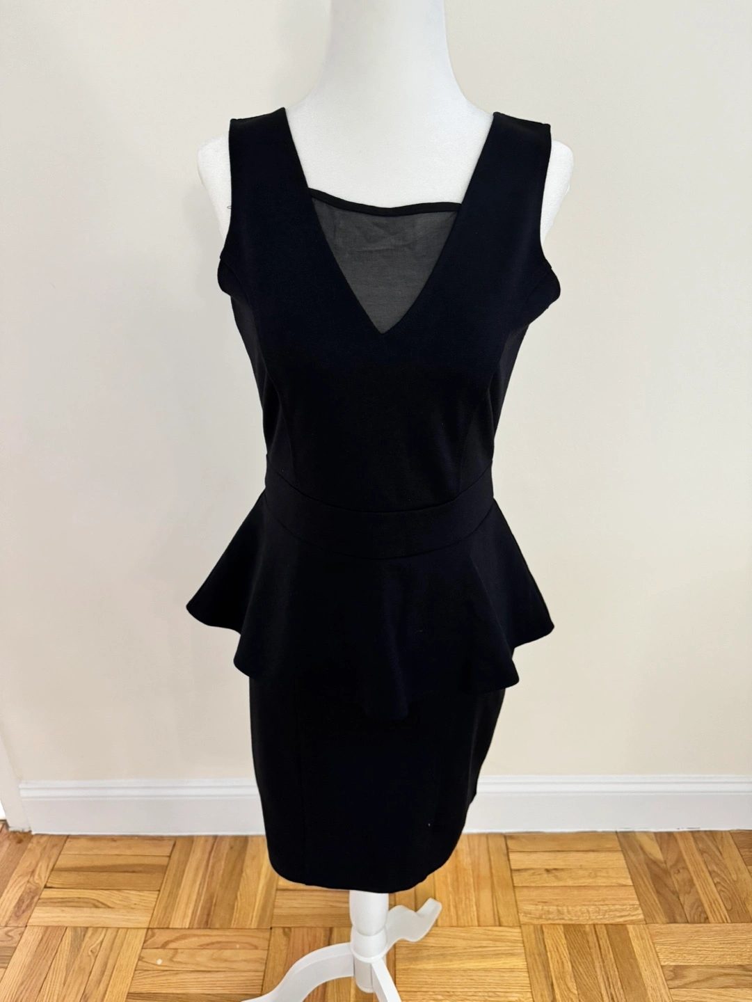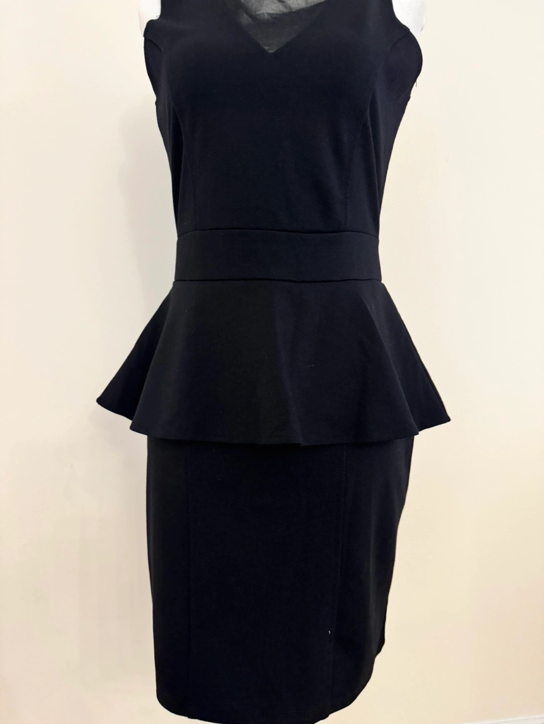 Black sleeveless peplum dress. Fitted bodice, layered peplum waist, and pencil skirt. Sheer V-neck detail. Back zipper closure.