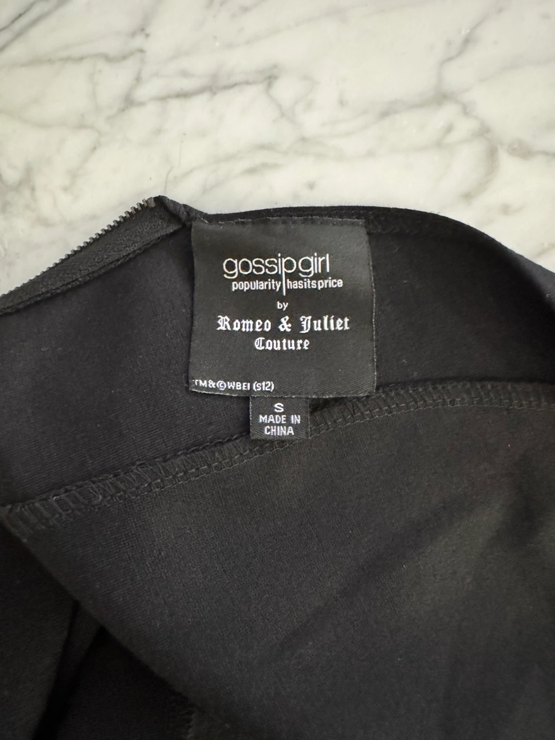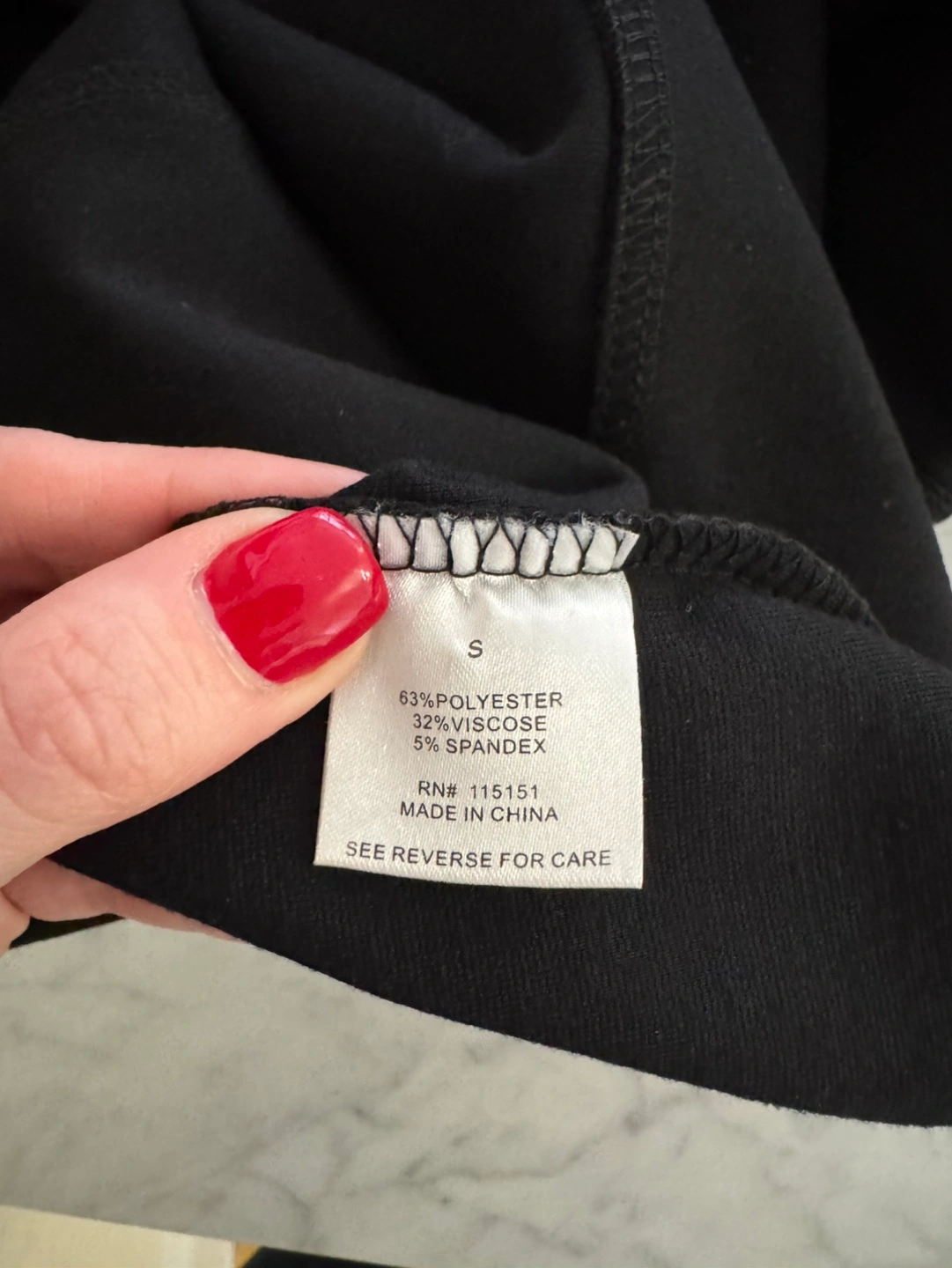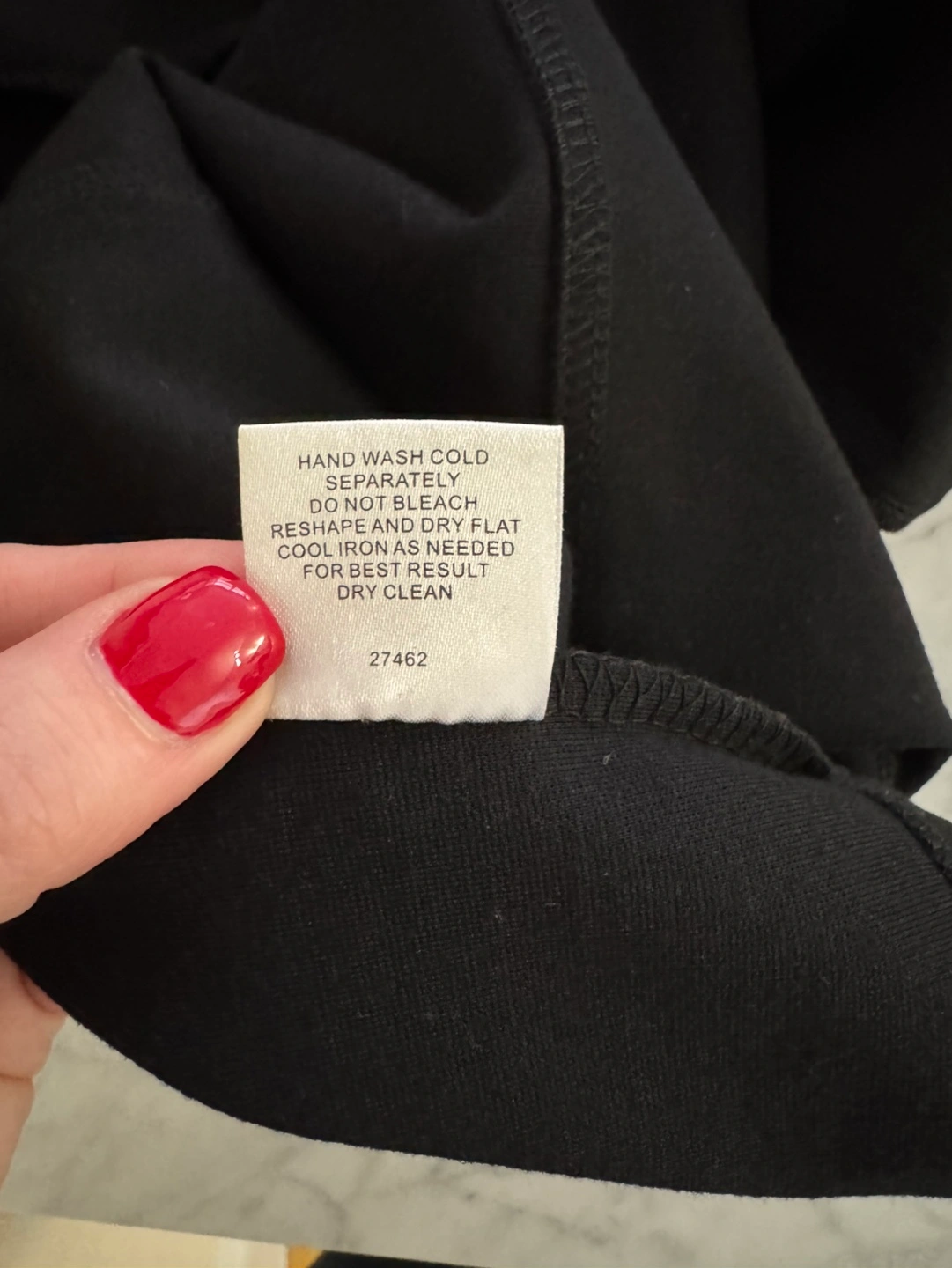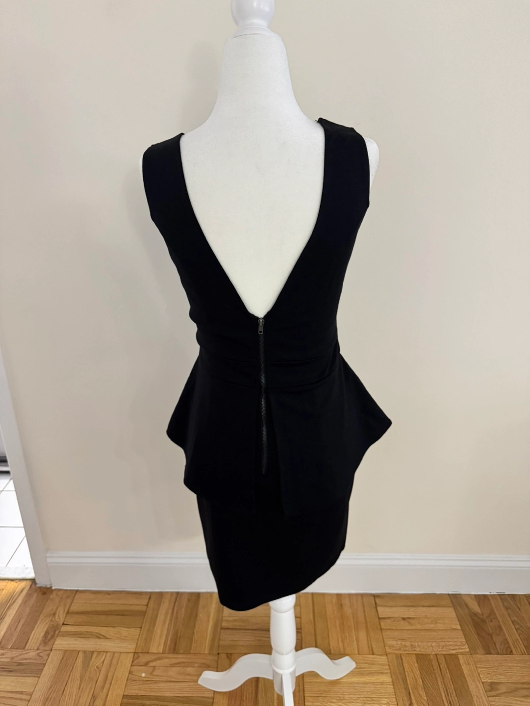 Black sleeveless peplum dress. Fitted bodice, layered peplum waist, and pencil skirt. Sheer V-neck detail. Back zipper closure.