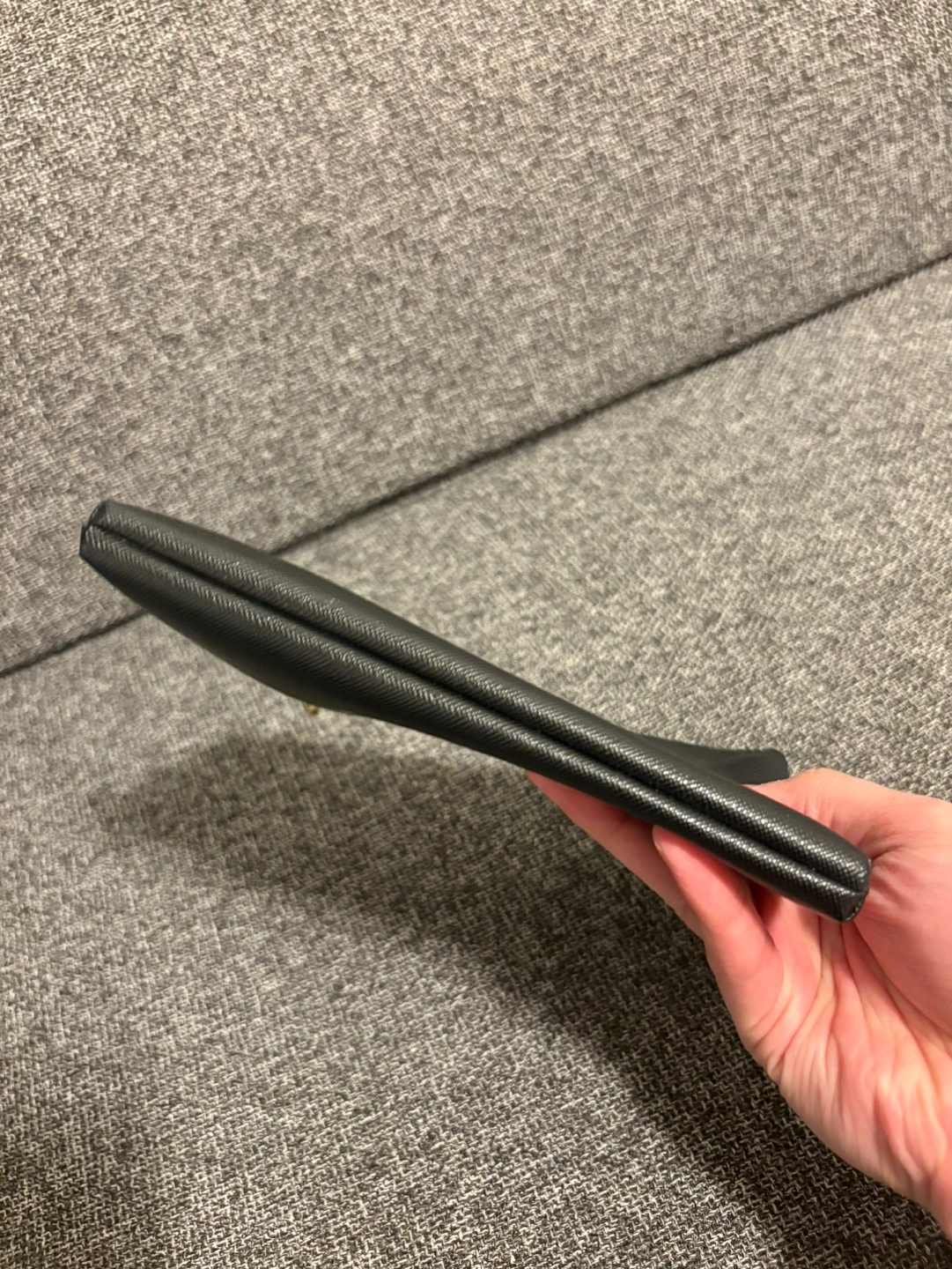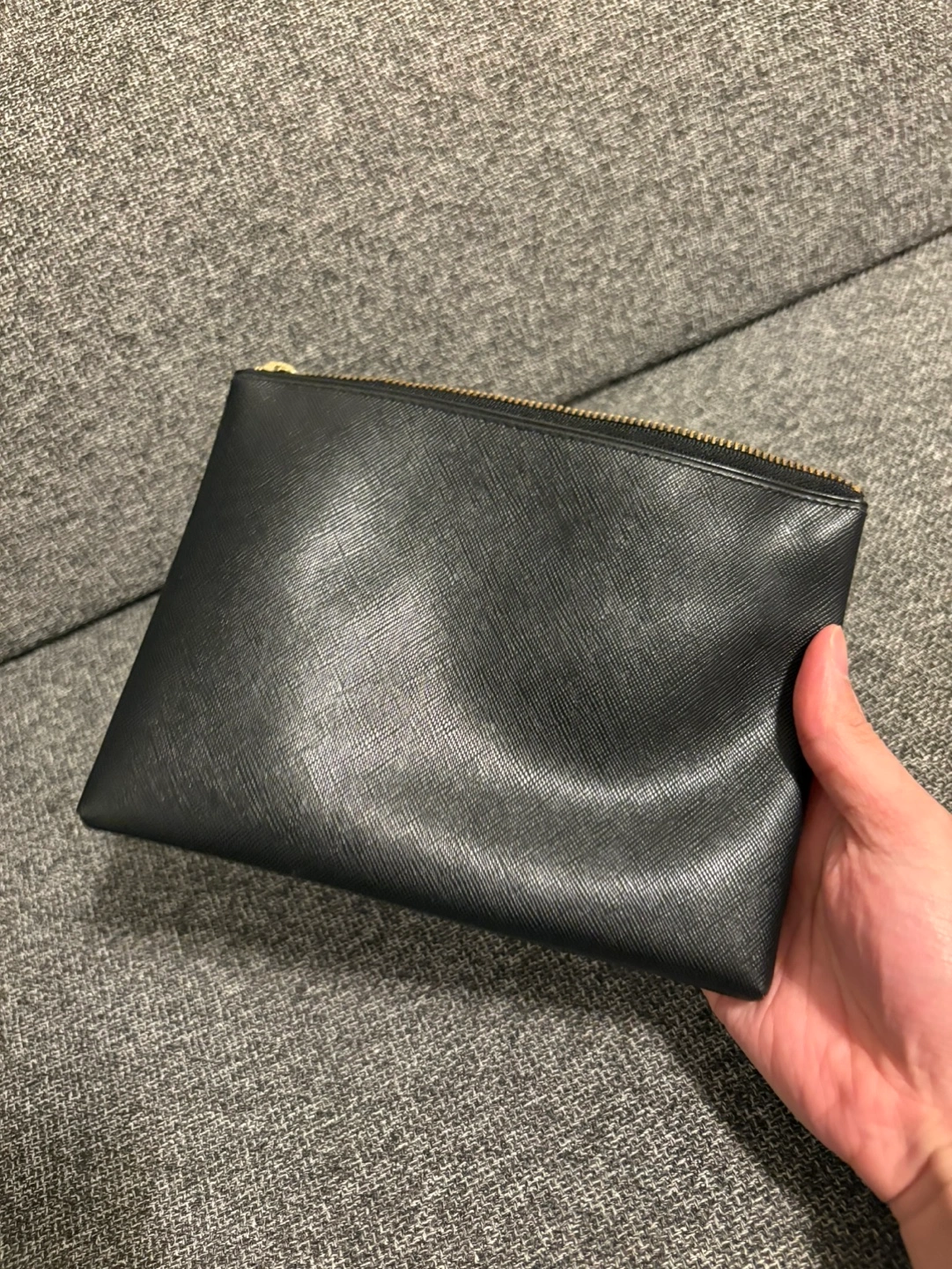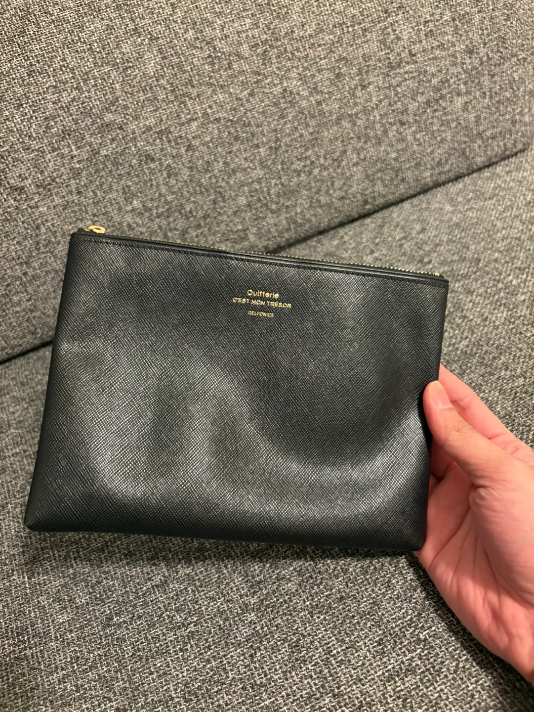 Black zipper pouch. Gold zipper. Minimalist design. Great for travel or everyday use.