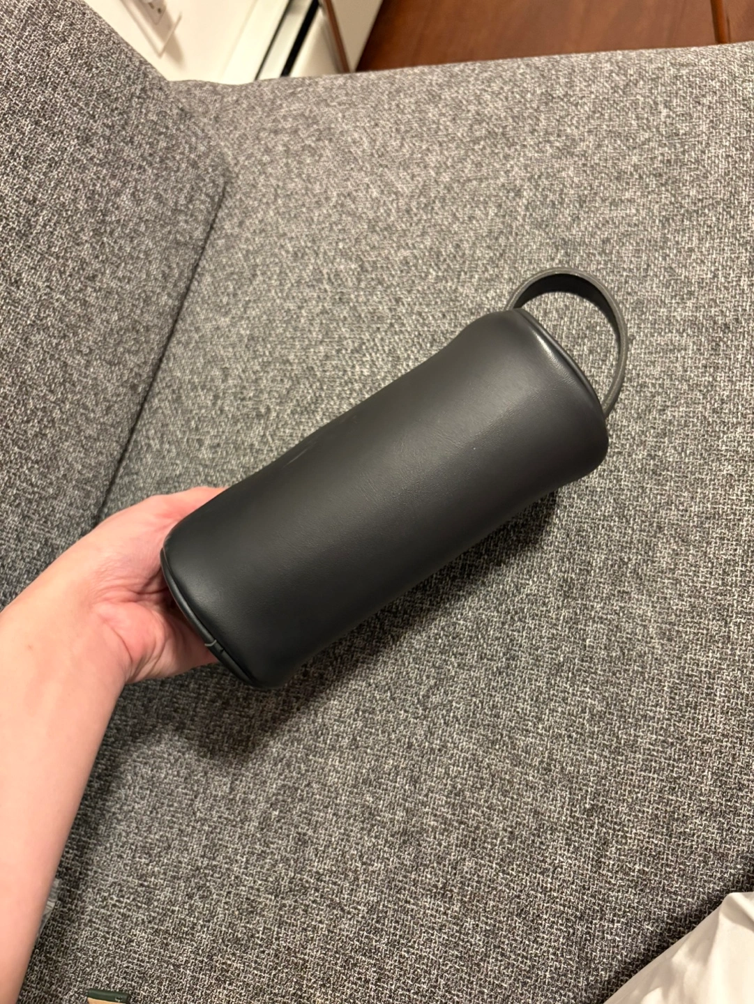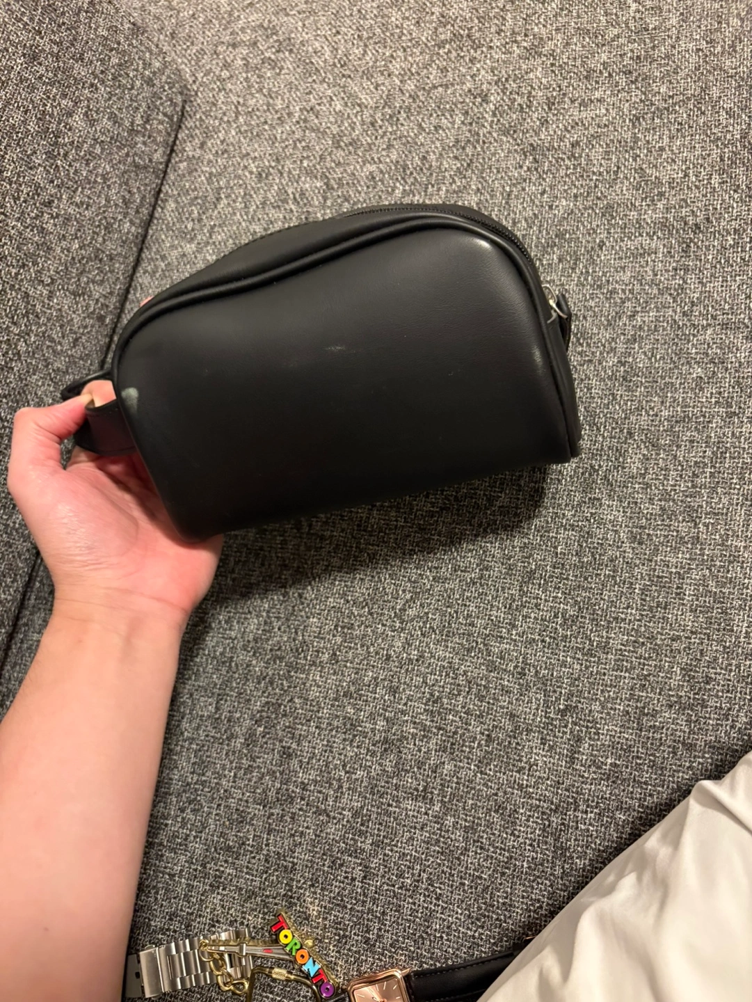 Small black zippered pouch. Features a carrying handle. Suitable for travel or toiletries. Shows some minor wear.
