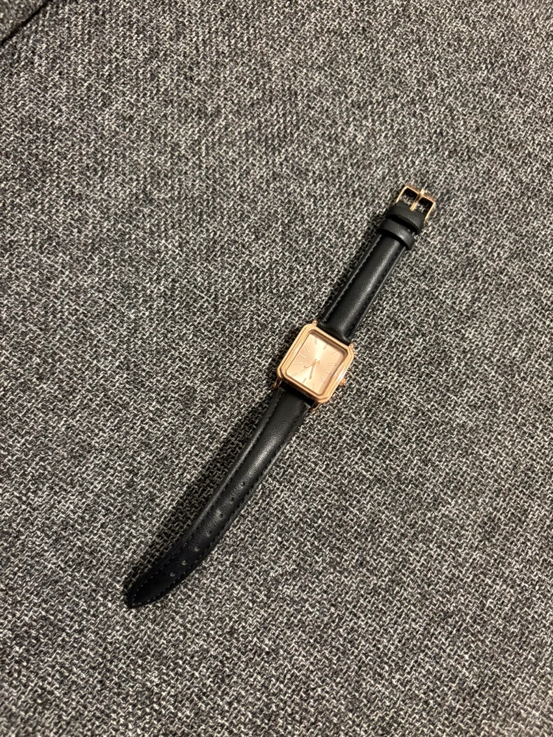 Women's wristwatch. Rose gold coloured case and hands. Black strap. Square face.