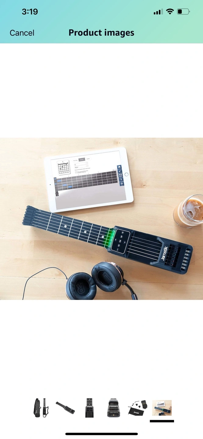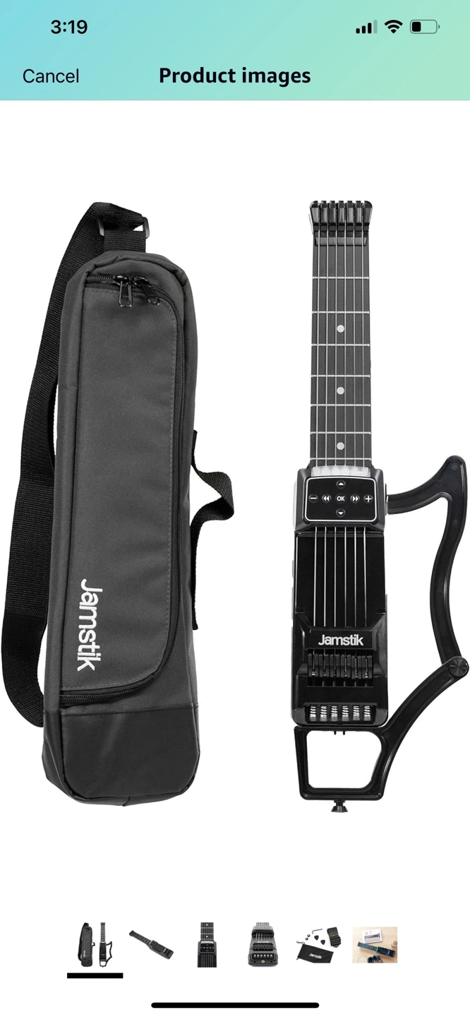 Portable smart guitar, includes carrying case, strap, picks, and instructional materials. Great for beginners. Compact and travel-friendly design.