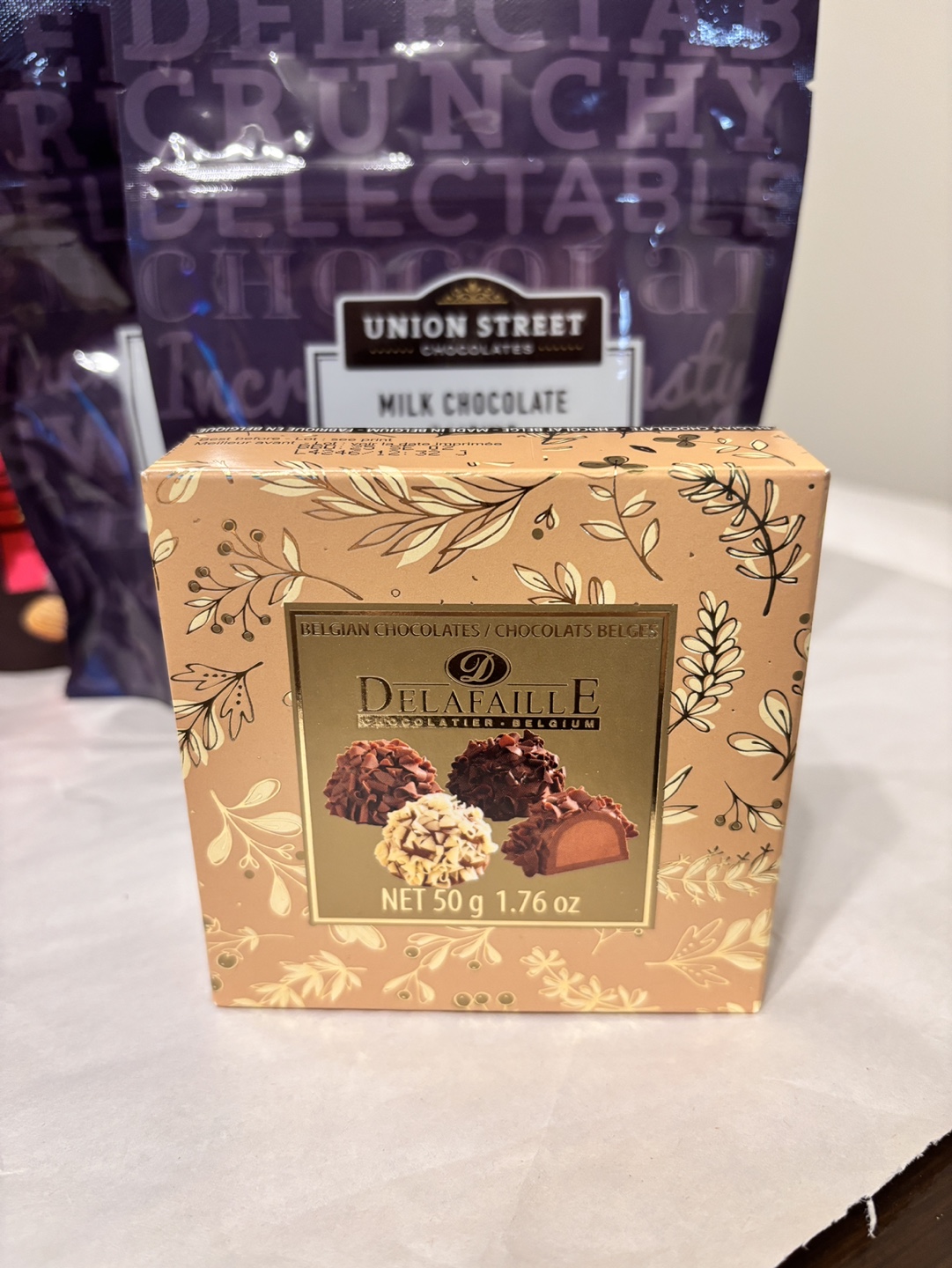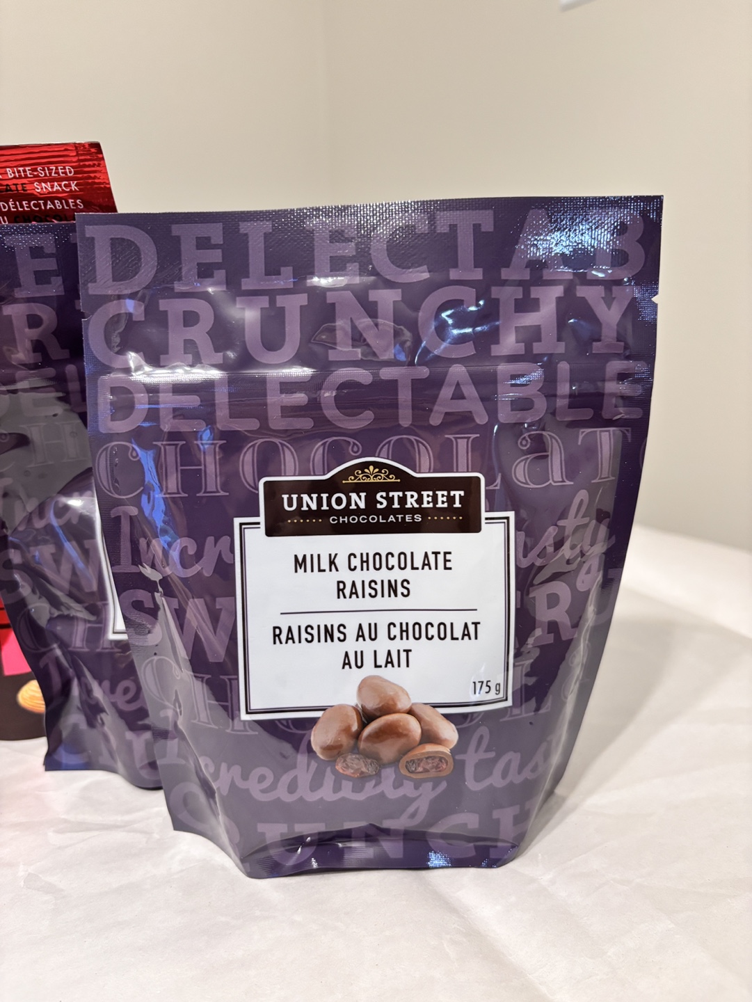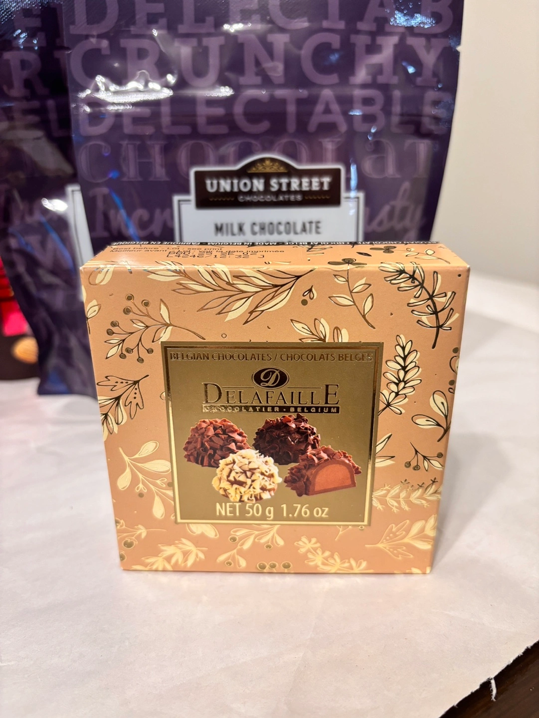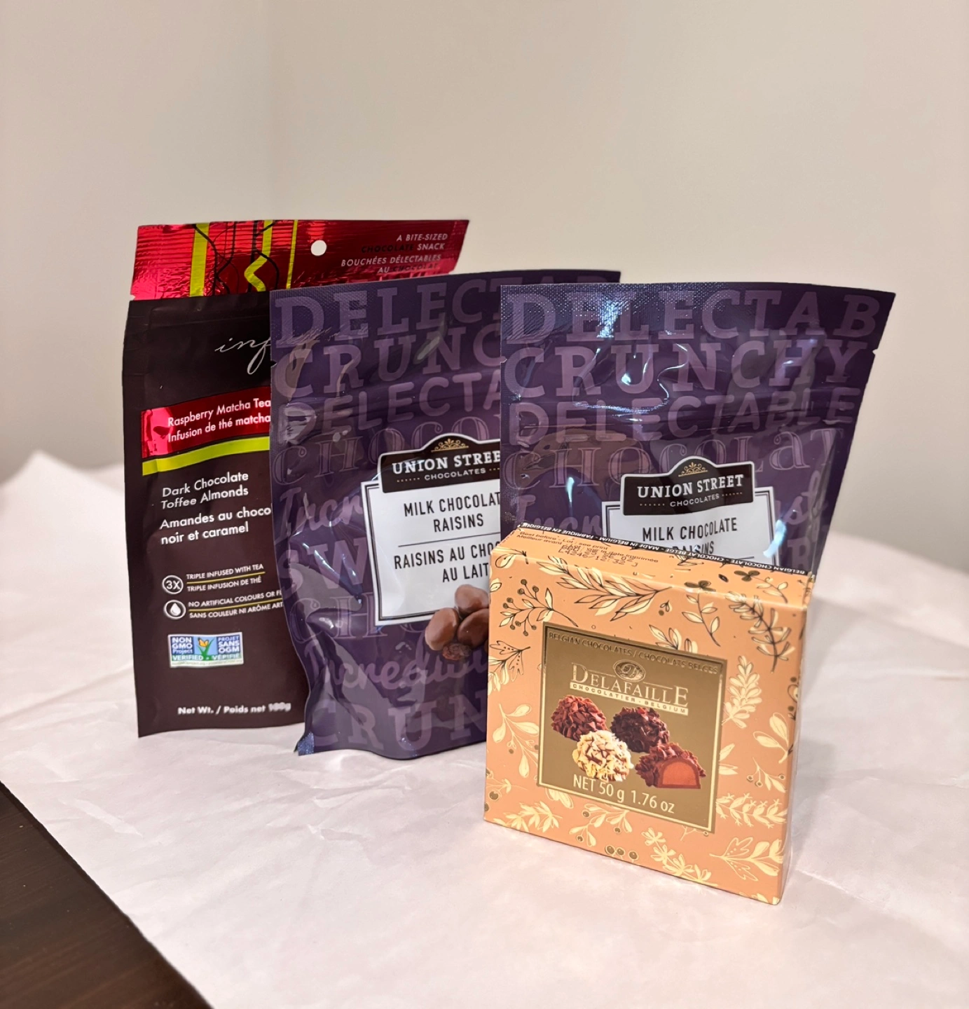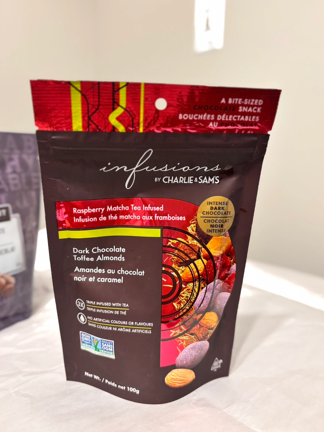 Includes milk chocolate raisins, raspberry matcha tea-infused dark chocolate almonds, and Belgian chocolates.