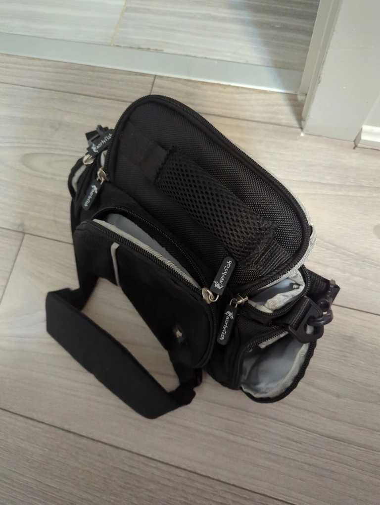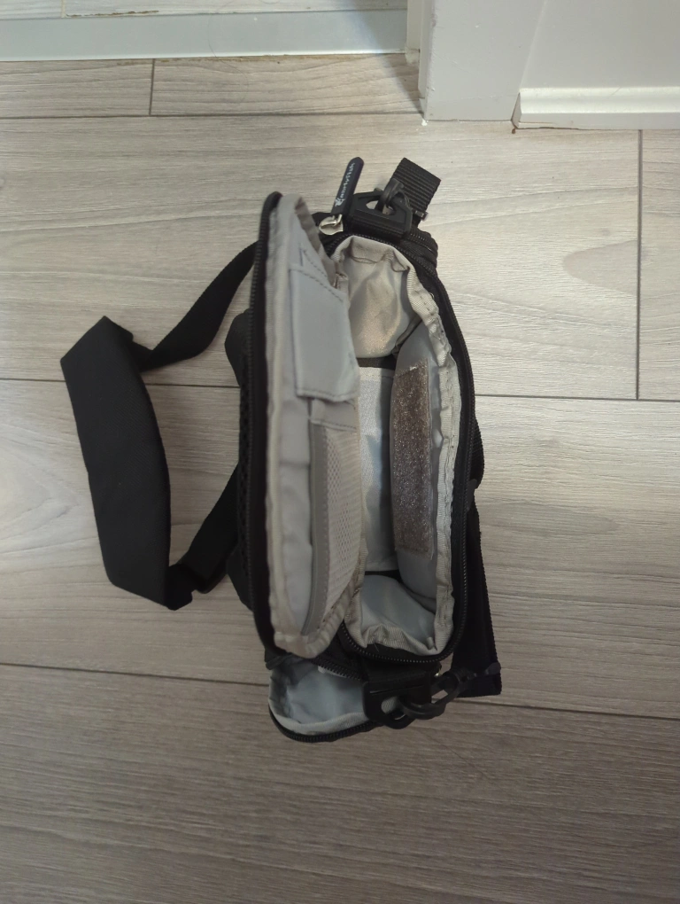 Small camera bag. Black. Adjustable strap. 4 compartments. 3.5 X 9 X 4 inch Pick up at Union or Distillery district