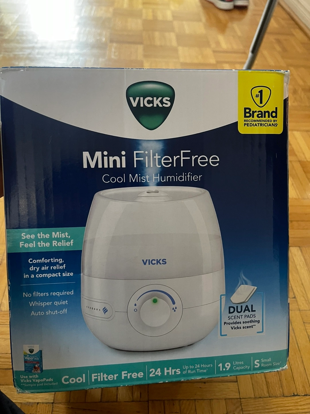 242Compact humidifier. Provides soothing dry air relief. Whisper quiet operation. Auto shut-off feature. No filters required. Includes Vicks VapoPad sample. Small room size.