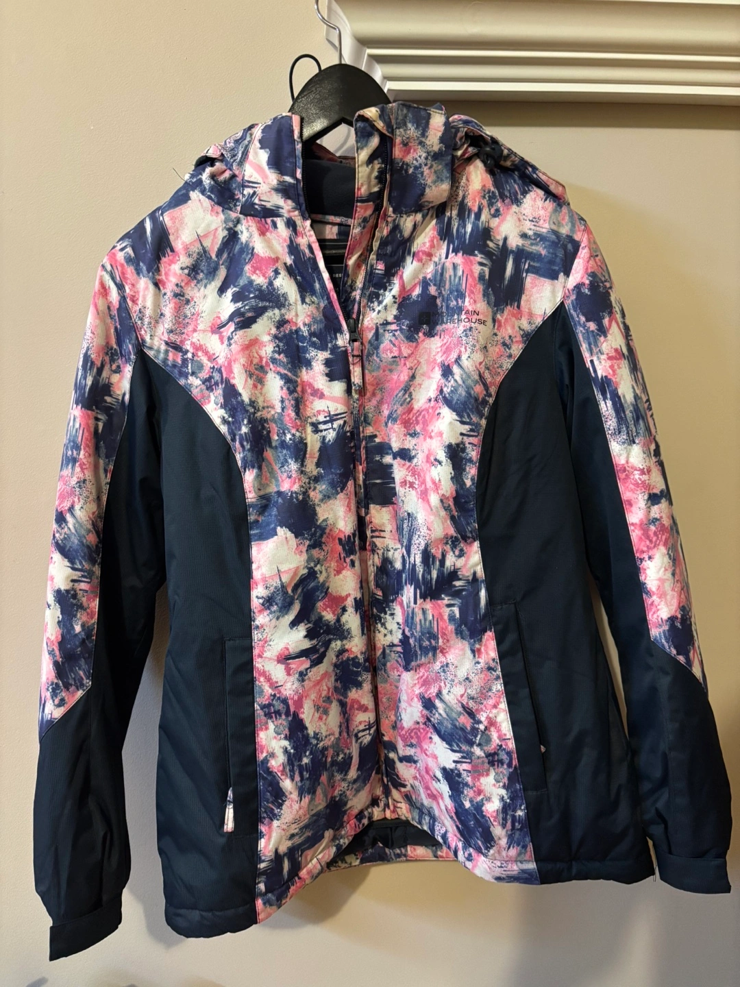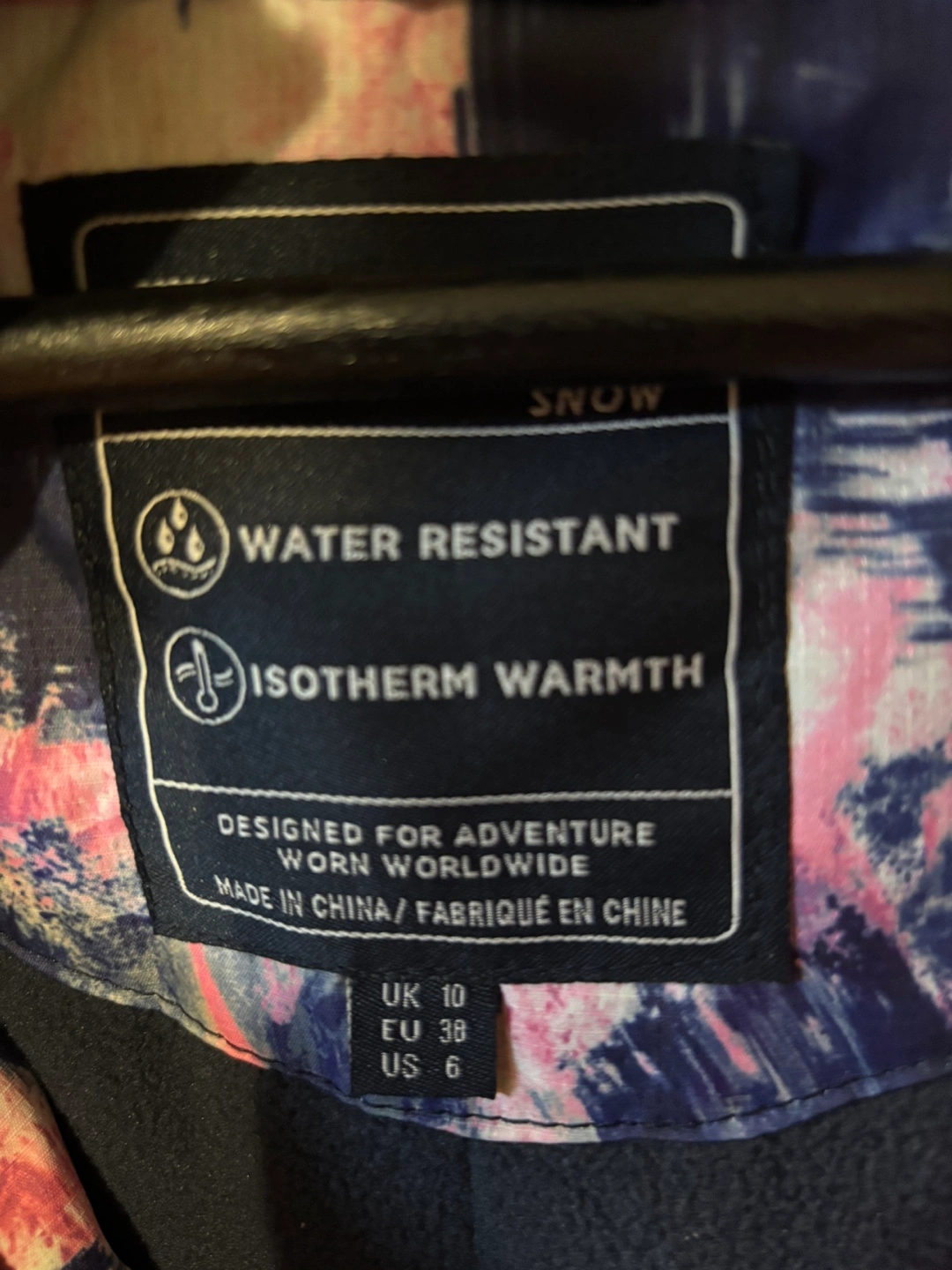 Mountain wear-house Women's water-resistant ski jacket. Features isotherm warmth. Pink, blue, and white floral pattern. Size 6 US/10 UK/38 EU. Made in China.