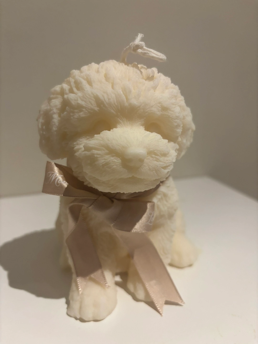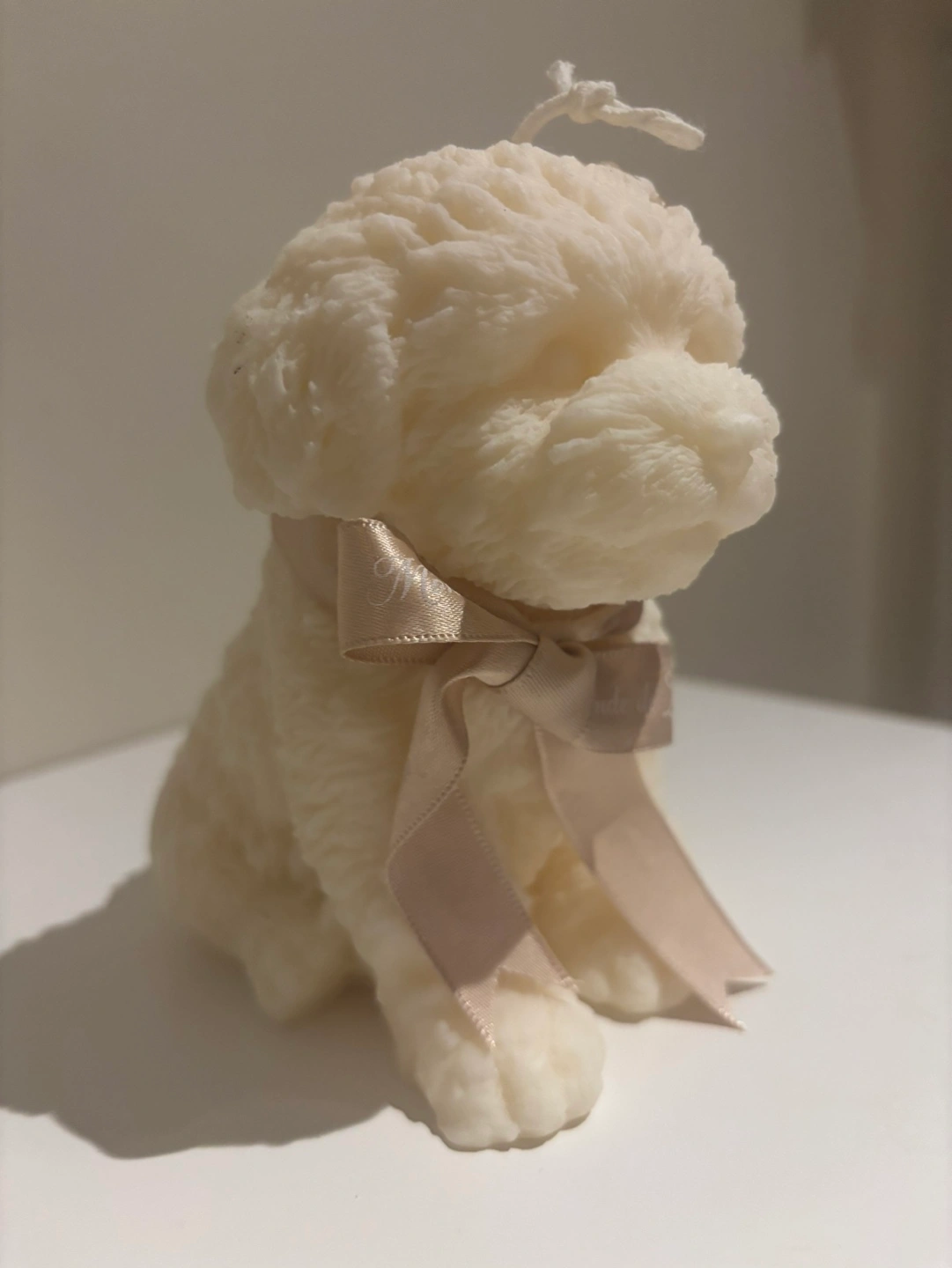 Unique candle shaped like a fluffy puppy. Off-white colour. Features a soft pink ribbon around its neck. Unlit.