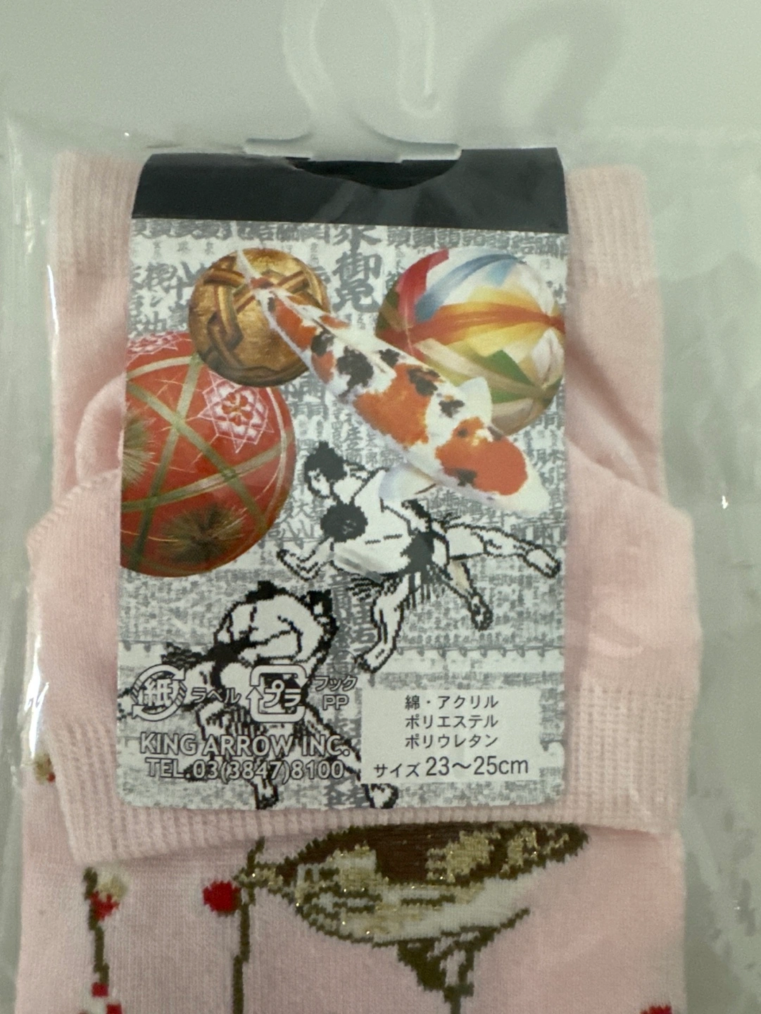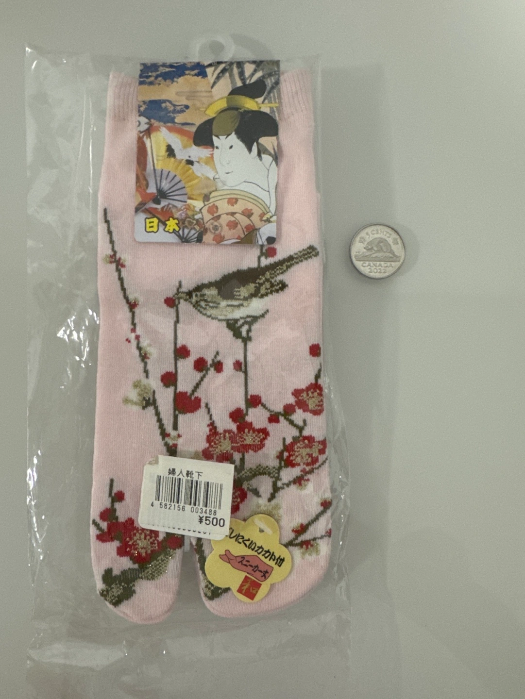 New, pink tabi socks. Features a delicate plum blossom print. Size 23-25cm. Sold in original packaging.