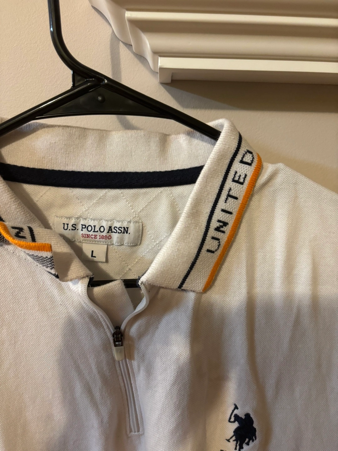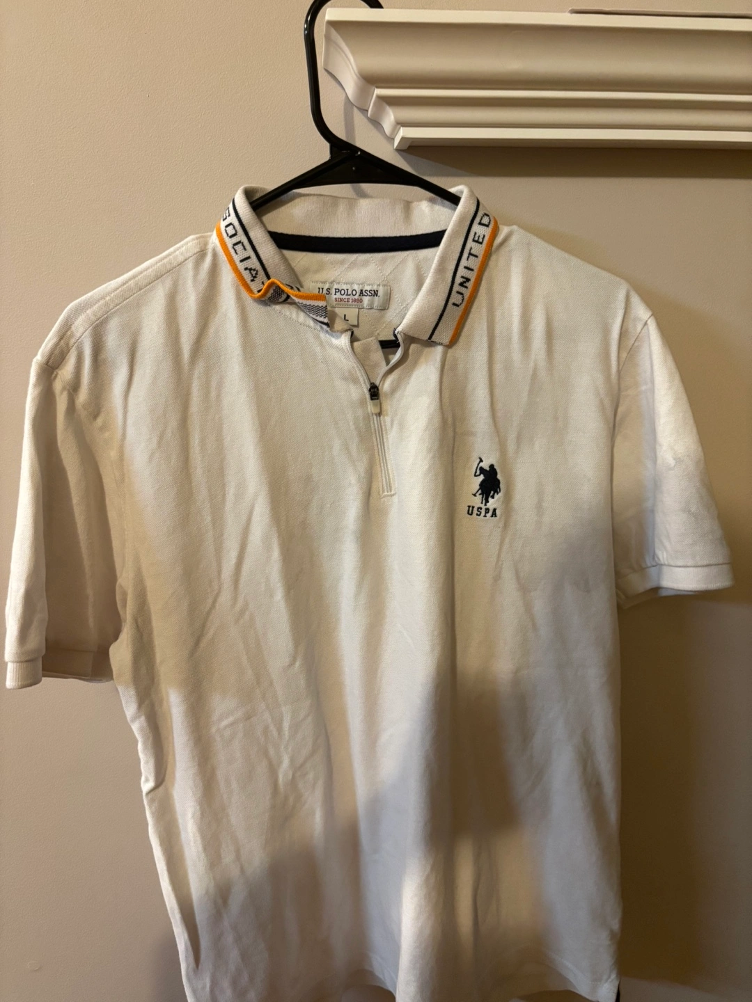 White short-sleeve polo shirt. Size large. Features a zipper closure and an embroidered logo. Orange and navy accents on collar.