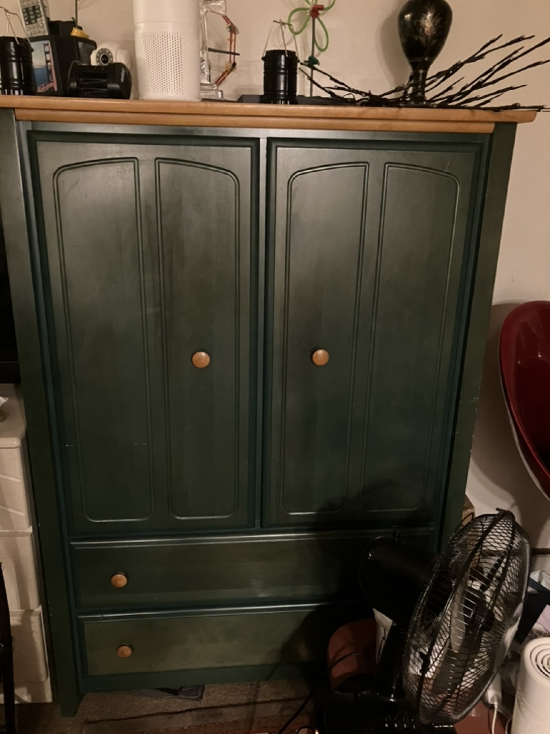 #freecycle listing. $ 0. Tall armoire, dark green finish. Features two doors with raised panels and two drawers below. Wooden top. Wood and particle board. I’ve had the Armour for a long time and it’s time for someone else to enjoy it.