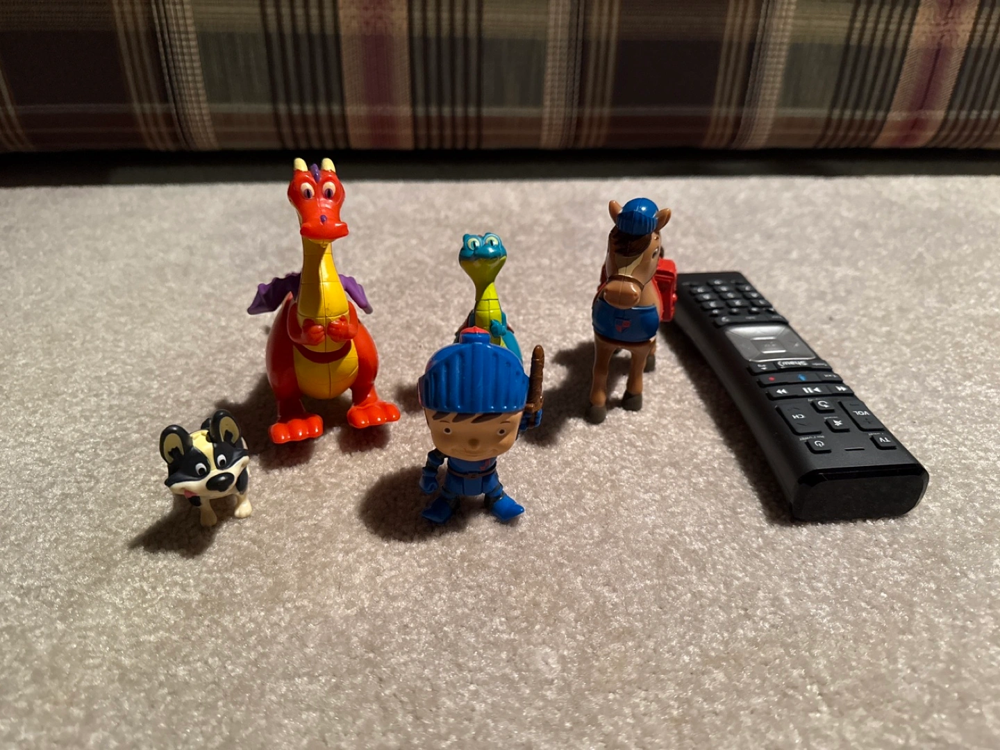 Collection of five small plastic figurines. Includes Mike the Knight, a dragon, a horse, a turtle, and a dog. Good condition. Perfect for imaginative play.