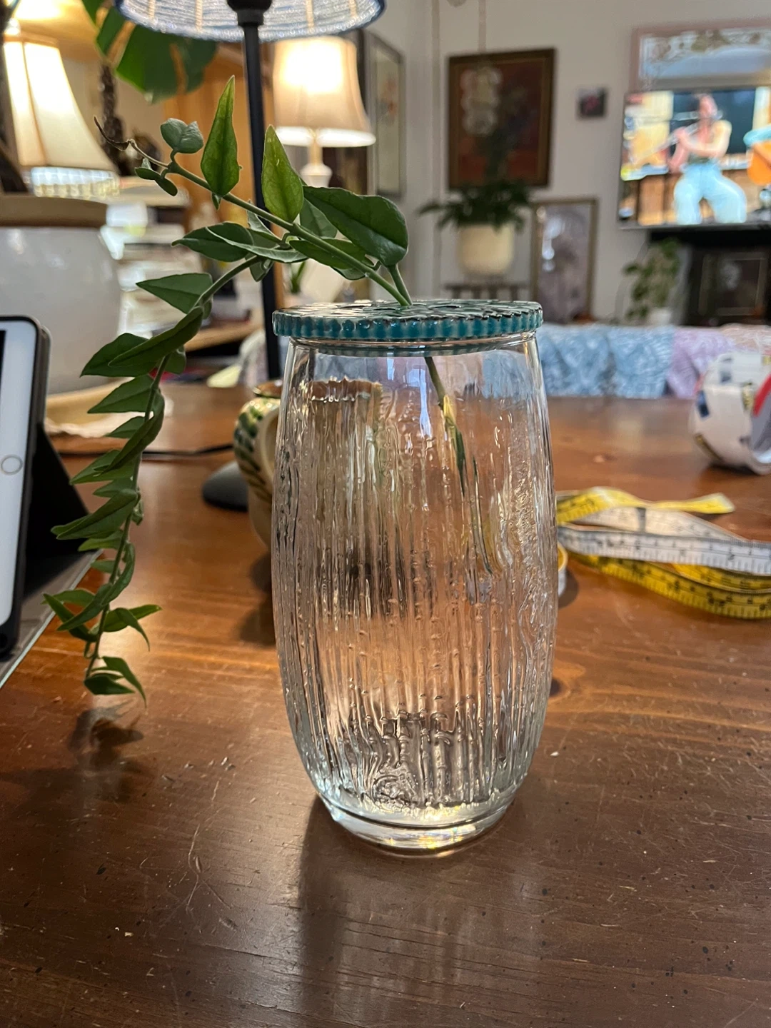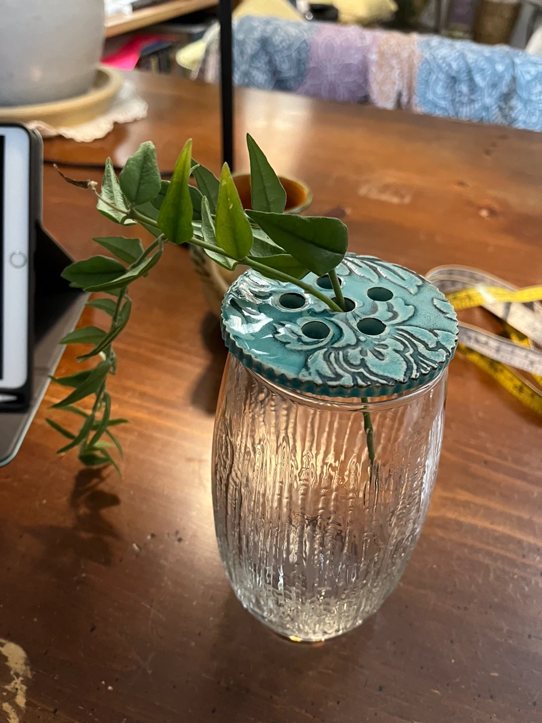 Glass vase with ceramic flower frog lid