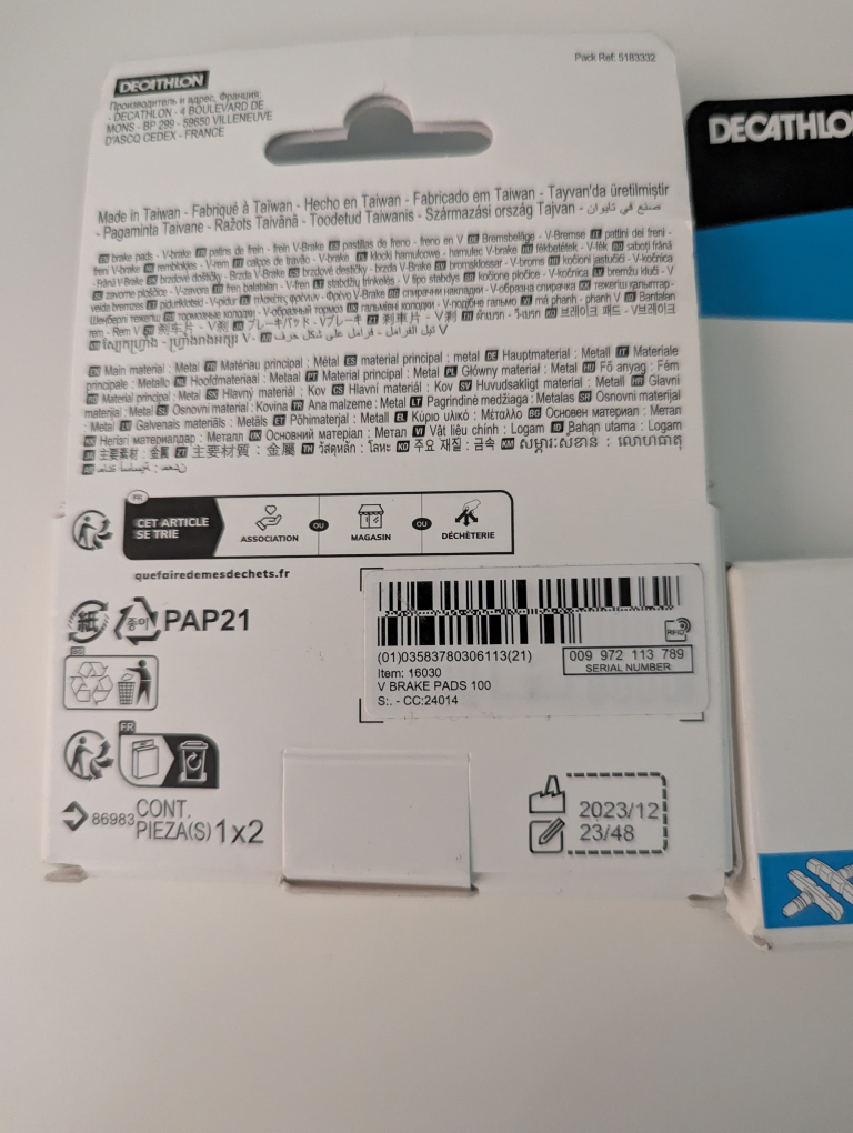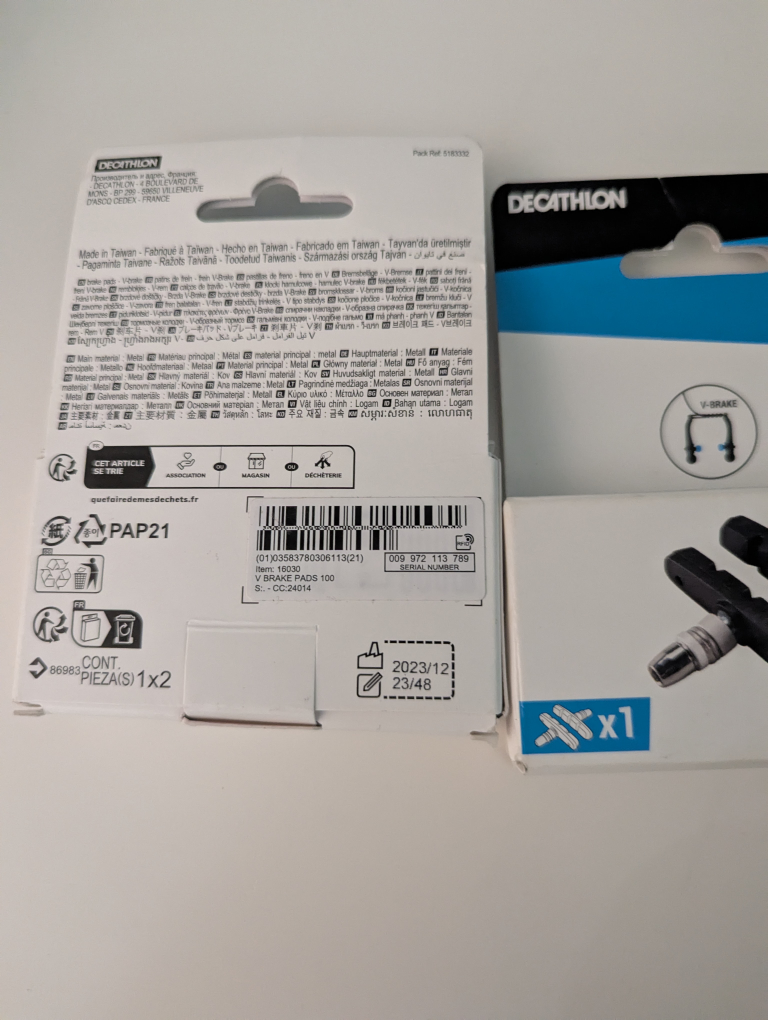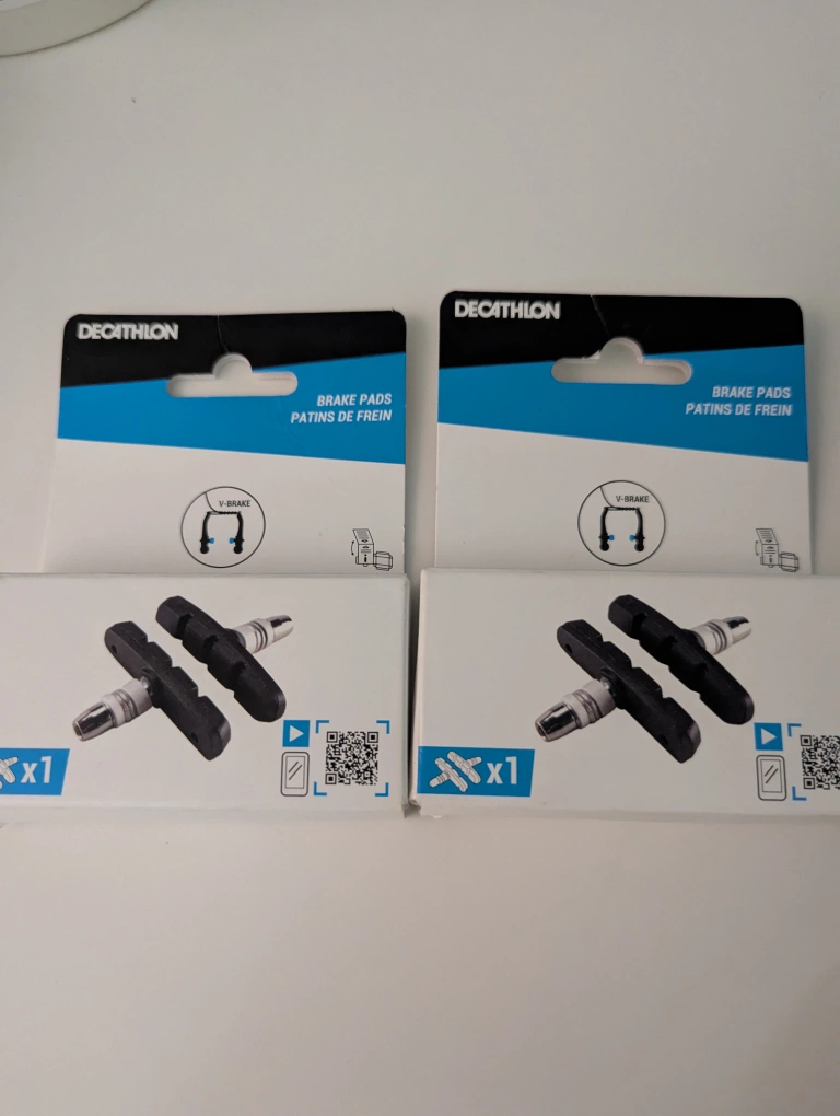 Two pairs of new Decathlon V-brake pads. Perfect for replacing worn-out brake pads. Easy installation. Made in Taiwan.