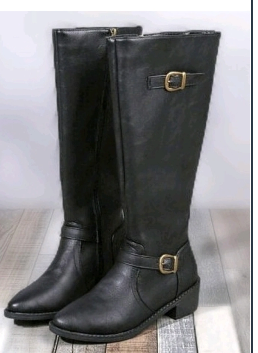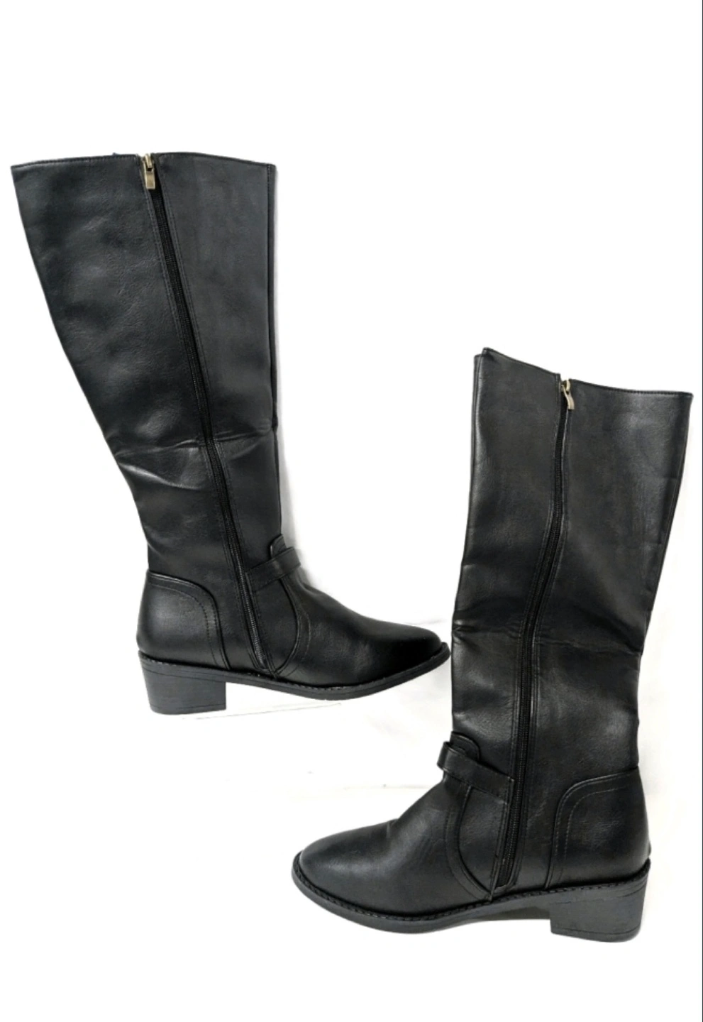 These are black knee-high boots with a sleek and structured design. They feature a slightly pointed toe and a low, chunky heel, making them both stylish for everyday wear. The boots have decorative gold-toned buckles—one near the ankle and another near the top of the shaft—adding a sophisticated touch. The material is a vegan leather with a smooth, matte finish. A side zipper allows for easy wear and removal. These boots are versatile and suitable for both casual and dressy outfits.