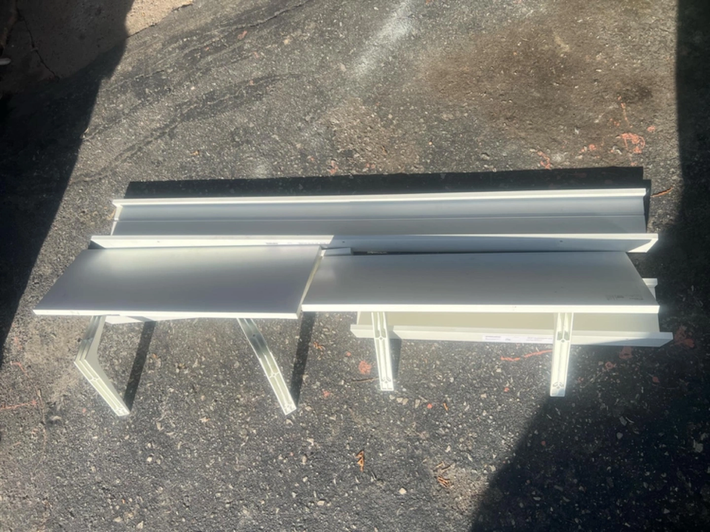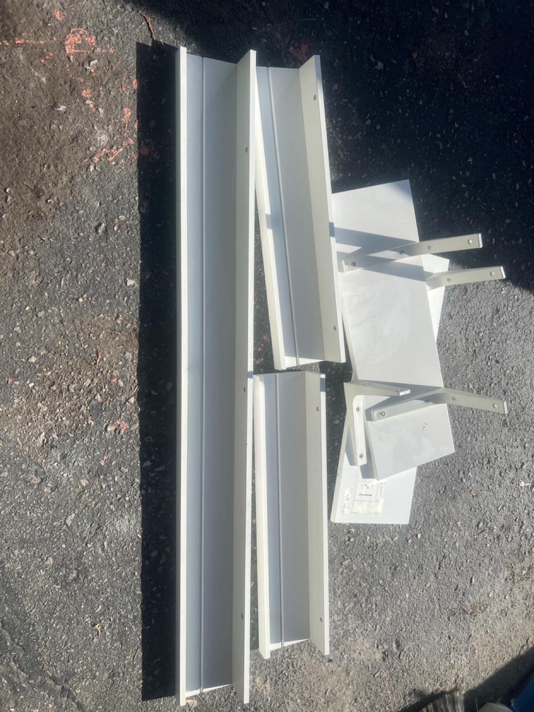 Take all for 5$. Set of unassembled white floating shelves. Includes shelves and brackets. Perfect for any room. Simple and modern design.