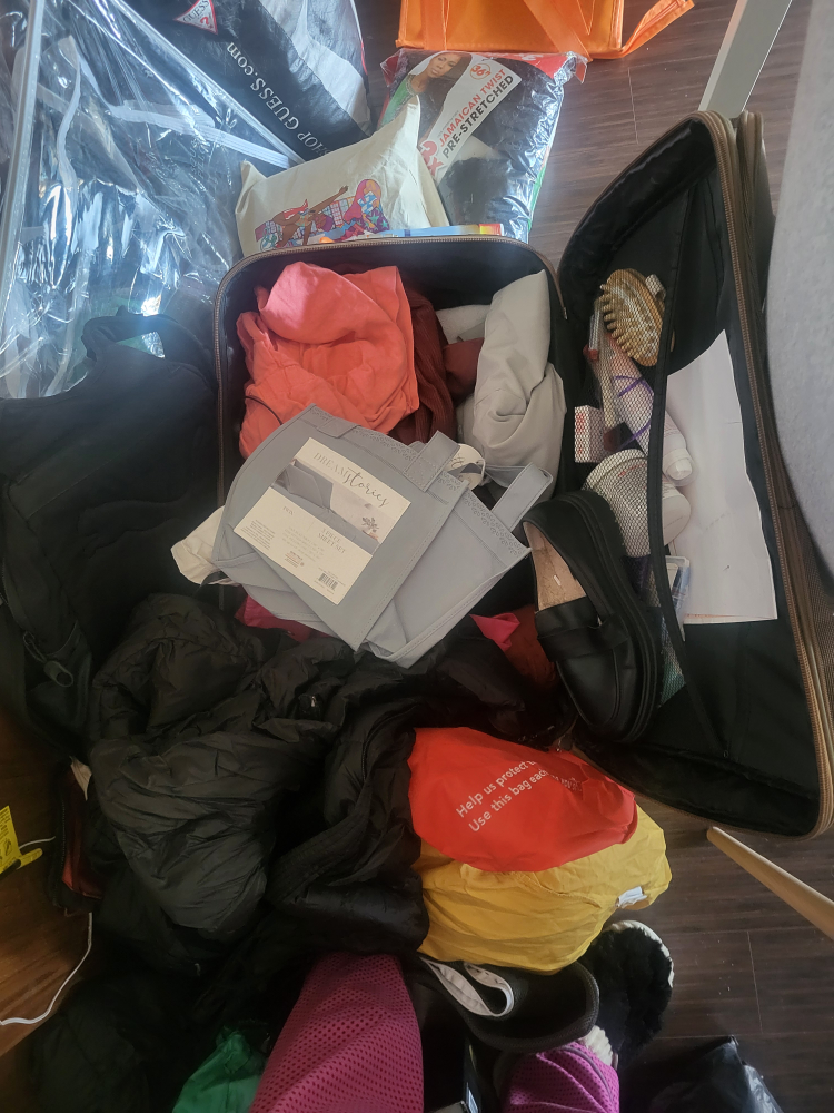 #freecycle Nail polish, febreze, dry shampoo, Aztec clay, play cards, two backpacks. Wheel broken Suitcase filled with clothing and accessories. Size 7 UK 40 9 primark shoes, Includes various items, mostly clothing. Perfect for travel or moving.