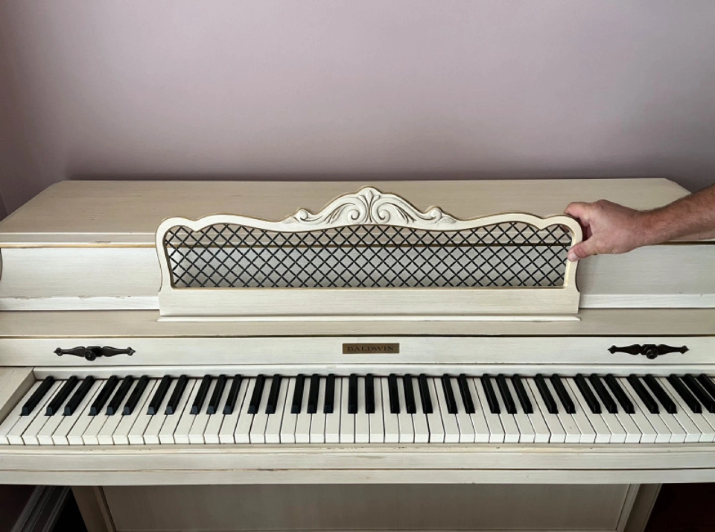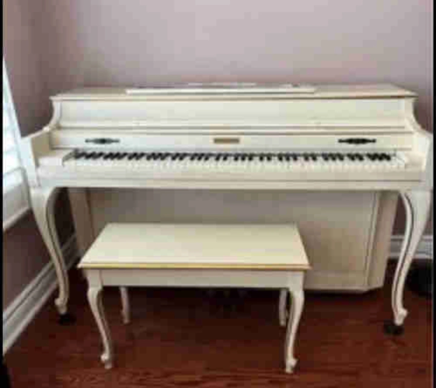 Beautiful vintage Baldwin spinet piano. Off-white finish. Includes matching bench. Made in the USA. Shows some wear. 1974 Baldwin Acrosonic Piano Dimensions: 58” L × 26” D × 36” H The piano is in good condition, but there are a few things to note: the second-to-last ebony key sticks (see photo), there are some scuffs on the wood, and the music stand needs to be reattached.