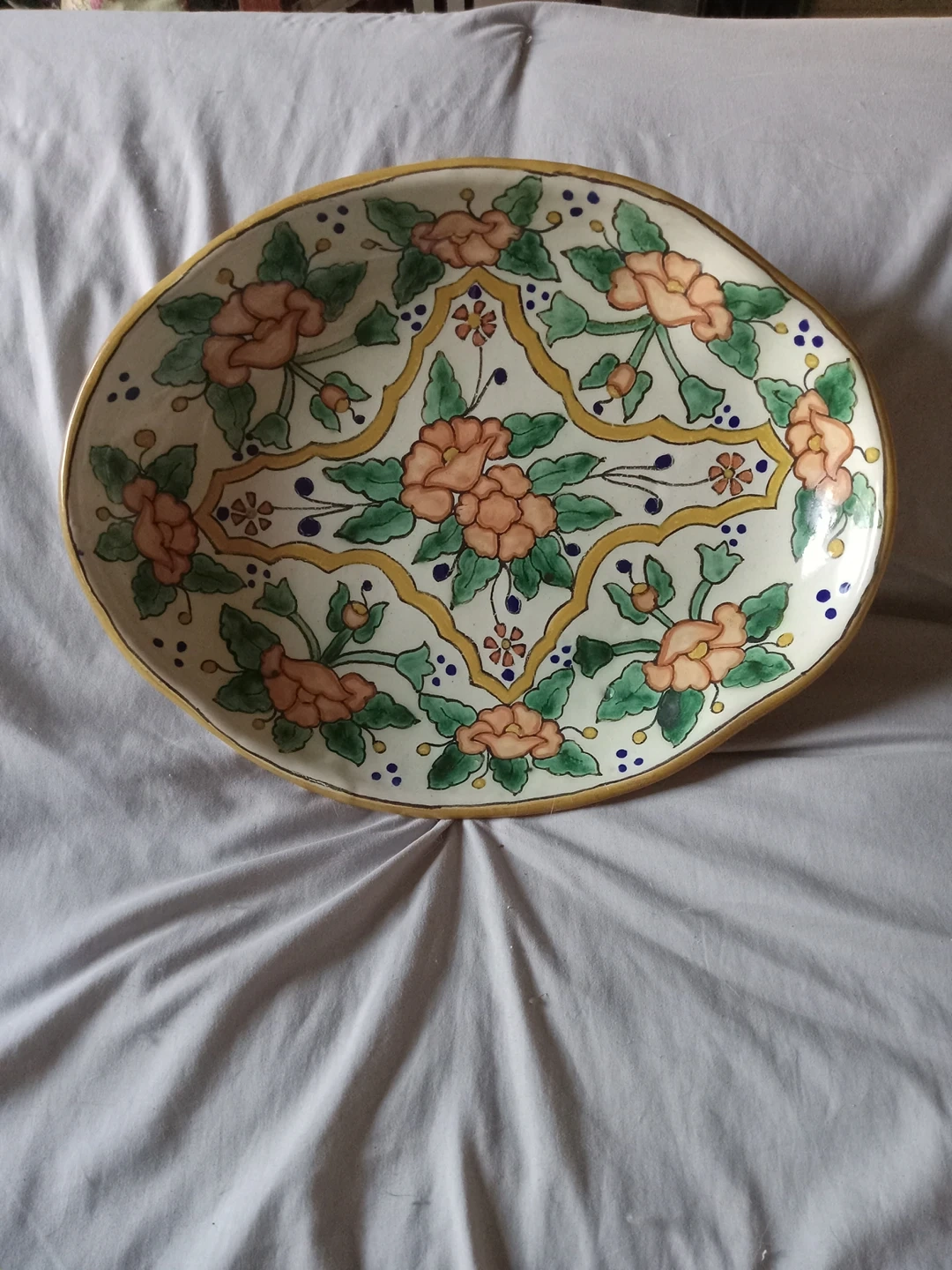 This is so beautifully hand painted. Nice oval serving platter, oohh, Natchos on a nice Spring BBQ Day! A serving platter, I am assuming no oven, no microwave and no dishwasher. It's in great condition, no chips, no discoloration and no hairline cracks. It's perfect!!! Very nice for display. Add a bit of Fiesta to your kitchen and parties! It is signed and numbered on the back. Door pick up.
