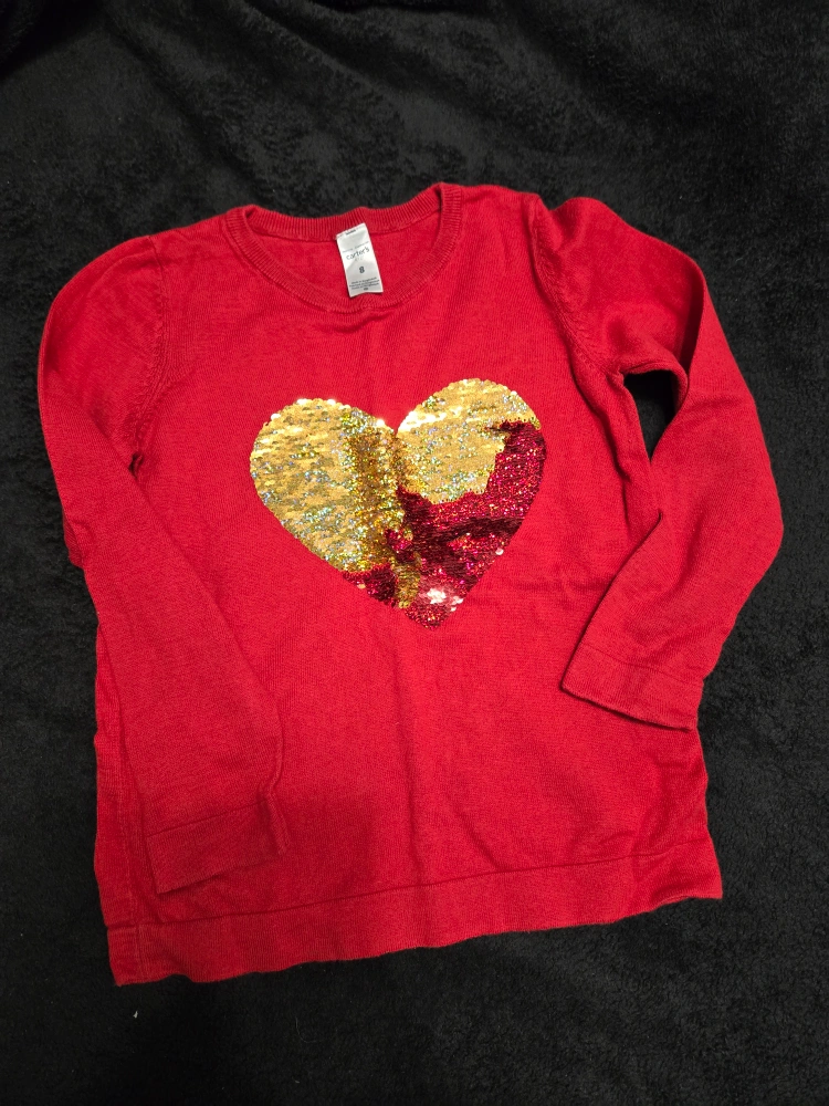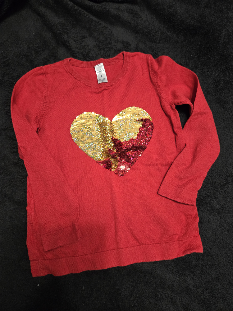 Red long-sleeved sweater. Features a sparkly gold and burgundy sequin heart. Size 8.