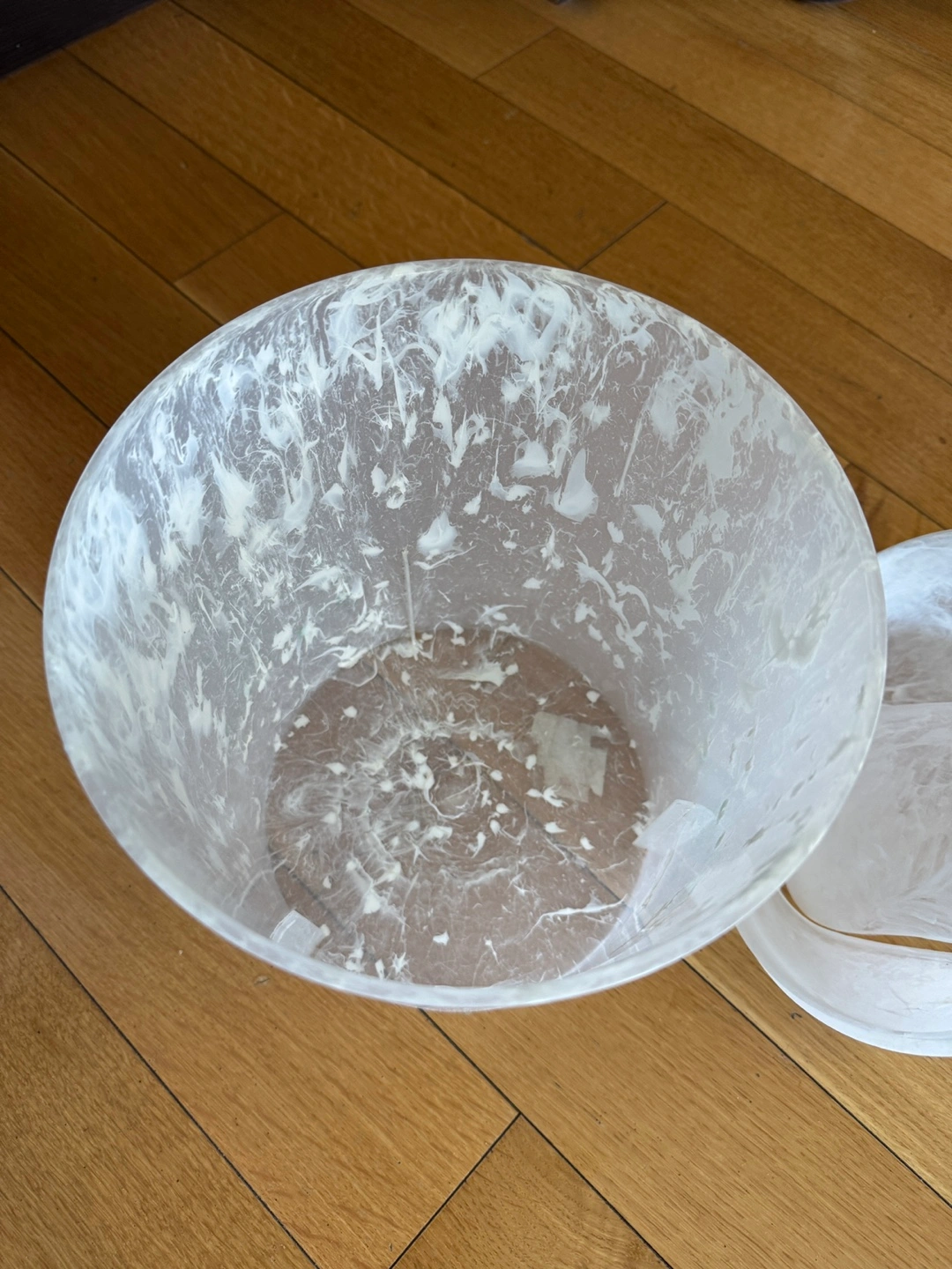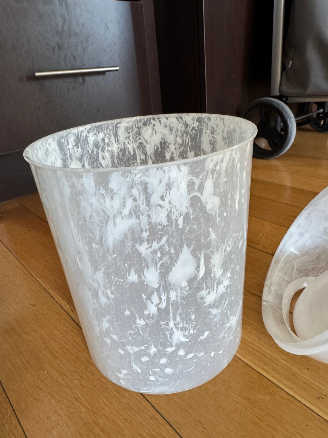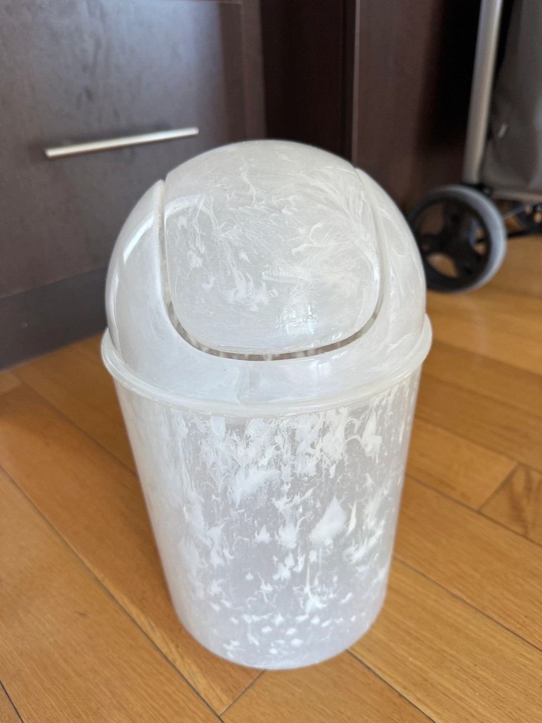 MOVING SALE Umbra Small Round Garbage Bin 5L Comes with Swinging Lid White Marble Pattern Made of a sturdy material; well-made 7.5” W x 8.8” H Retails for over $10 at Canadian Tire; discontinued In great condition; do damages Pick-up near Sherbourne and Wellesley See other listings for more items for sale