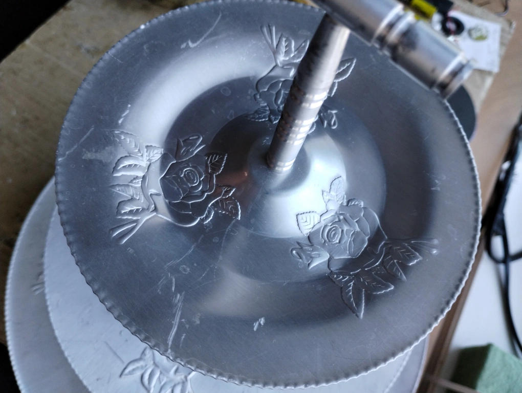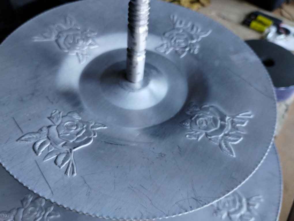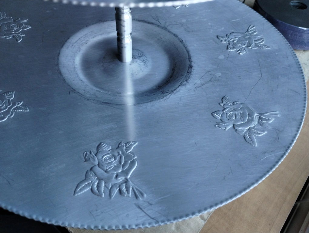 Aluminium three-tiered serving stand. Features embossed rose pattern. Shows some wear. Great for parties or displaying baked goods. Sandwiches cakes, and more..... levels are 12" , 8" and 6" diameter.