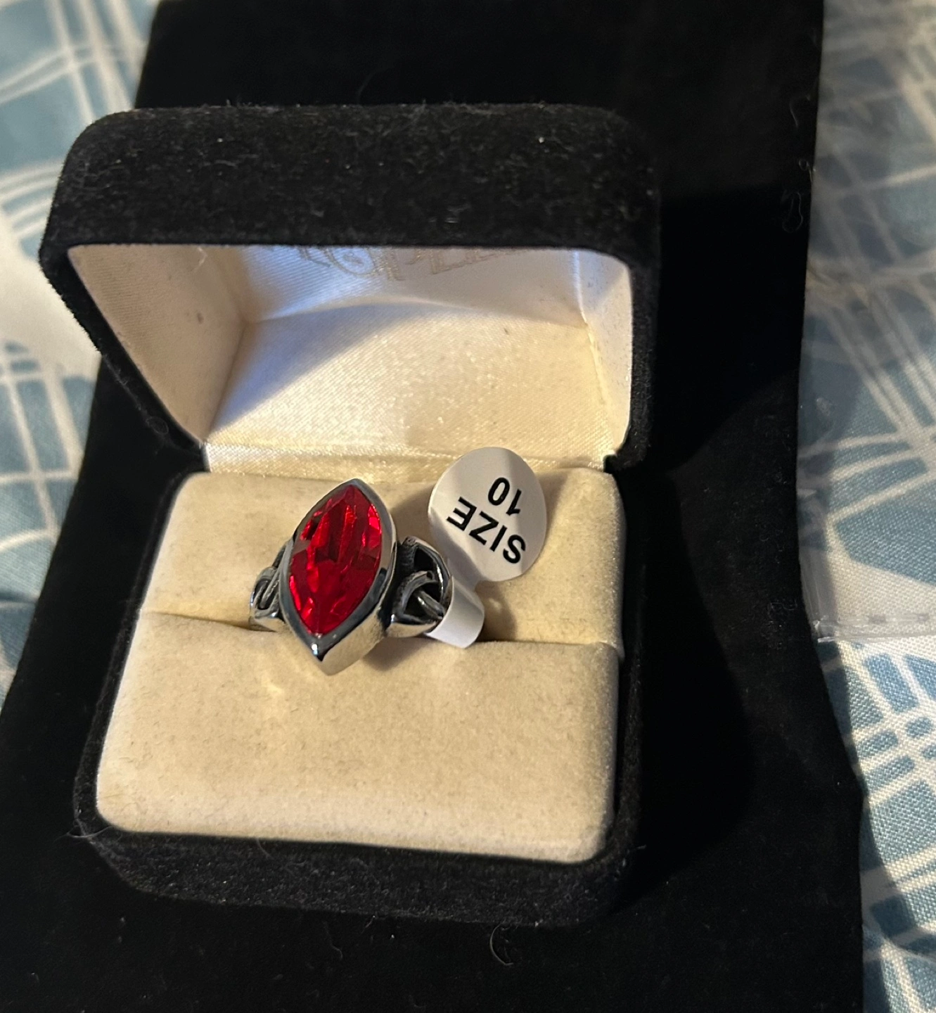 Stunning ring features a large red marquise-cut stone. Celtic knot design. Size 10. Comes in a jewelry box.