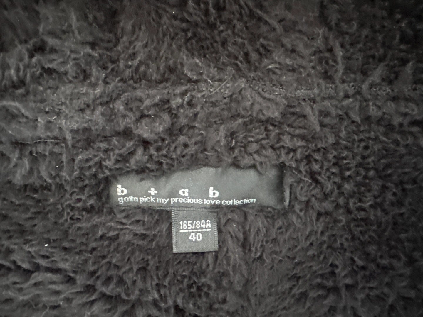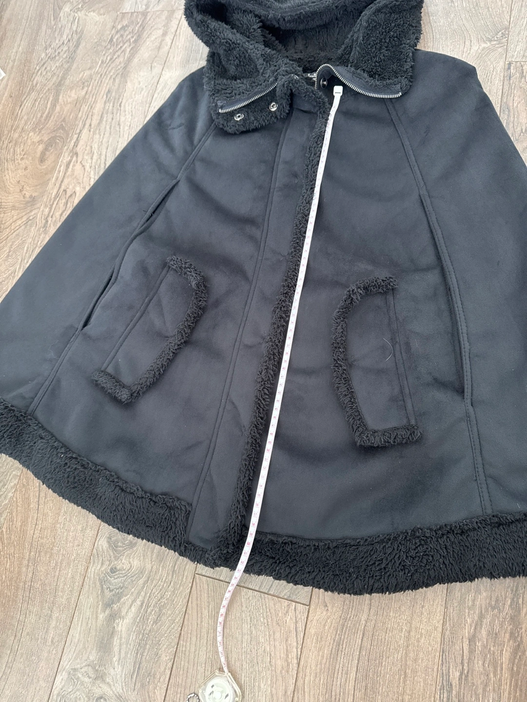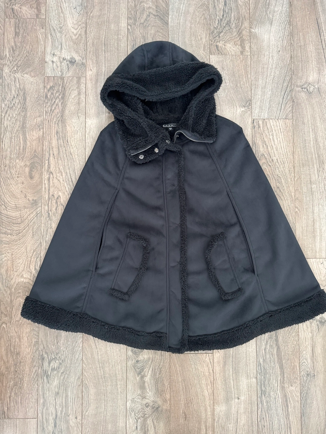 Black hooded cape. Features a sherpa-lined hood and hem. Zip-up front. Two pockets. Size 40.