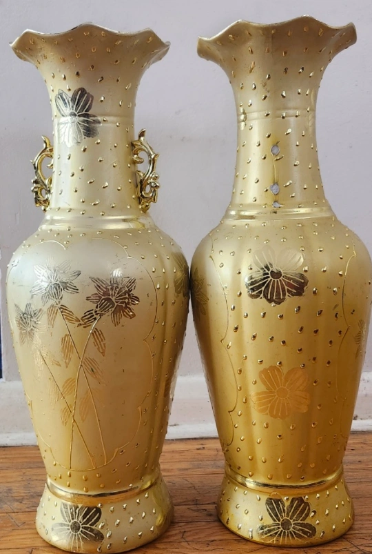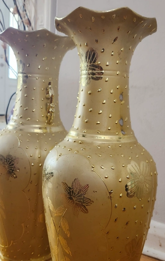 Elegant pair of gold vases. Features ornate floral designs and gold accents. Unique, decorative pieces. Excellent for home décor.