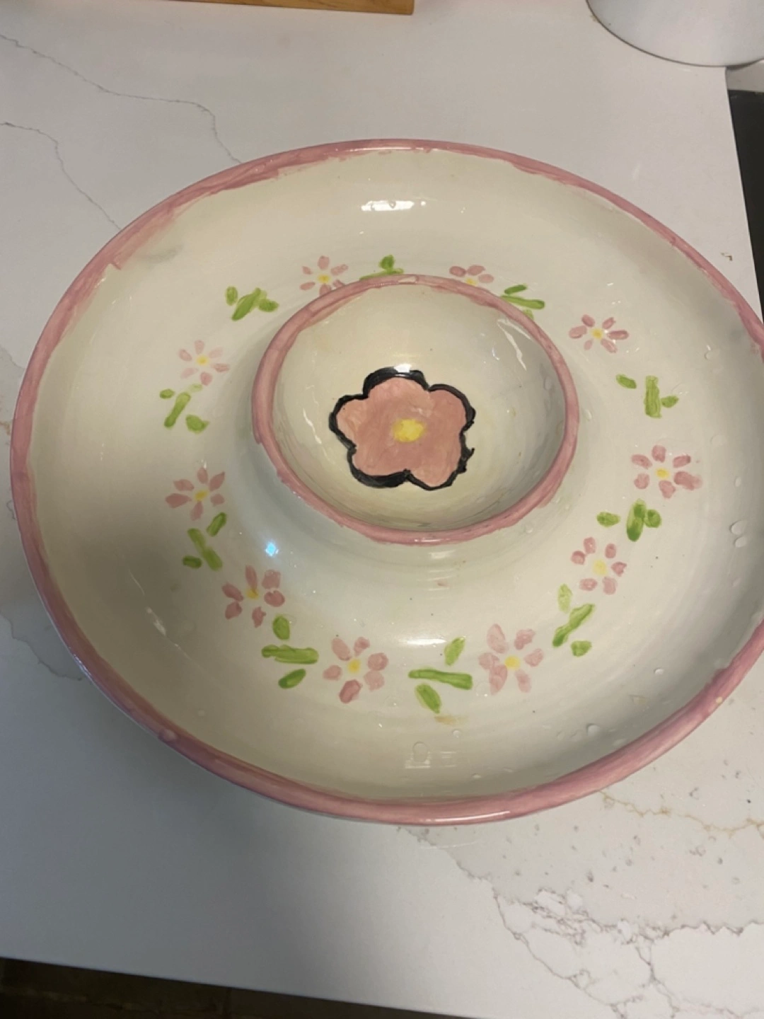574Adorable chip and dip bowl. Features a floral design. Perfect for parties.