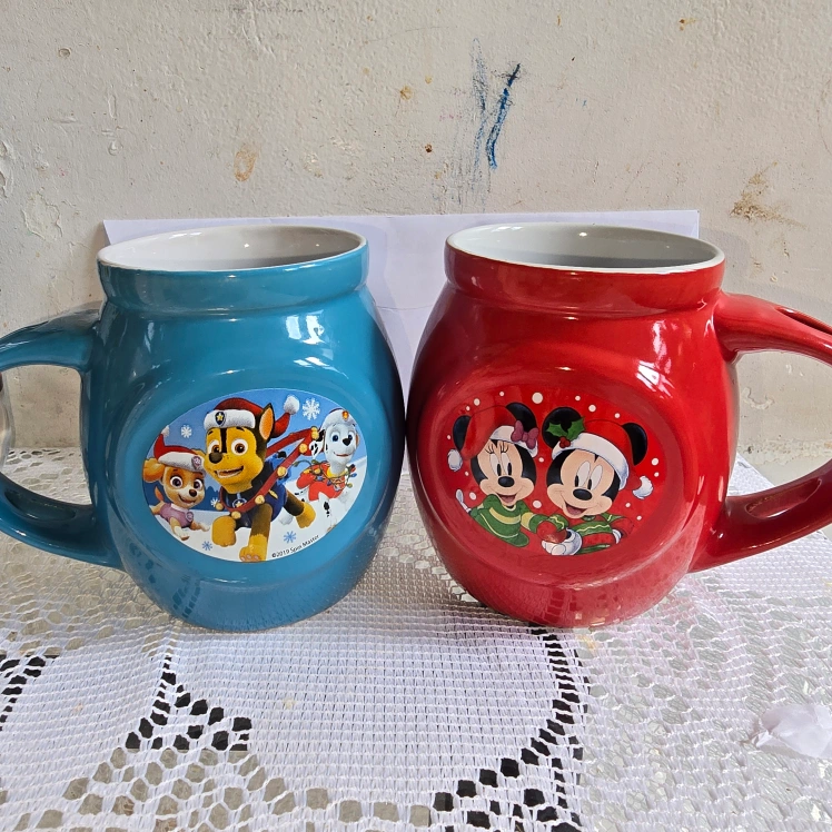 Two ceramic mugs featuring Paw Patrol and Mickey Mouse Christmas designs. Set includes four small glass jars, three small glasses, three shot glasses and one glass mug. Perfect for hot beverages or storage.