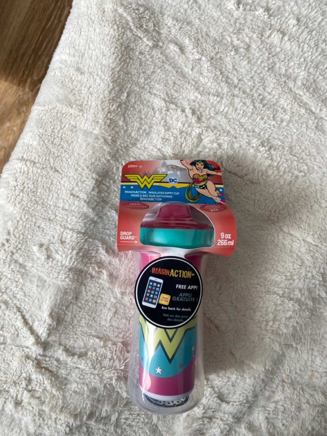 9 oz insulated sippy cup. Features Wonder Woman design. Leakproof and BPA free. ImaginAction app compatible. 12m+