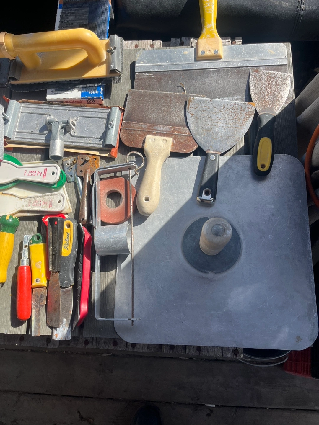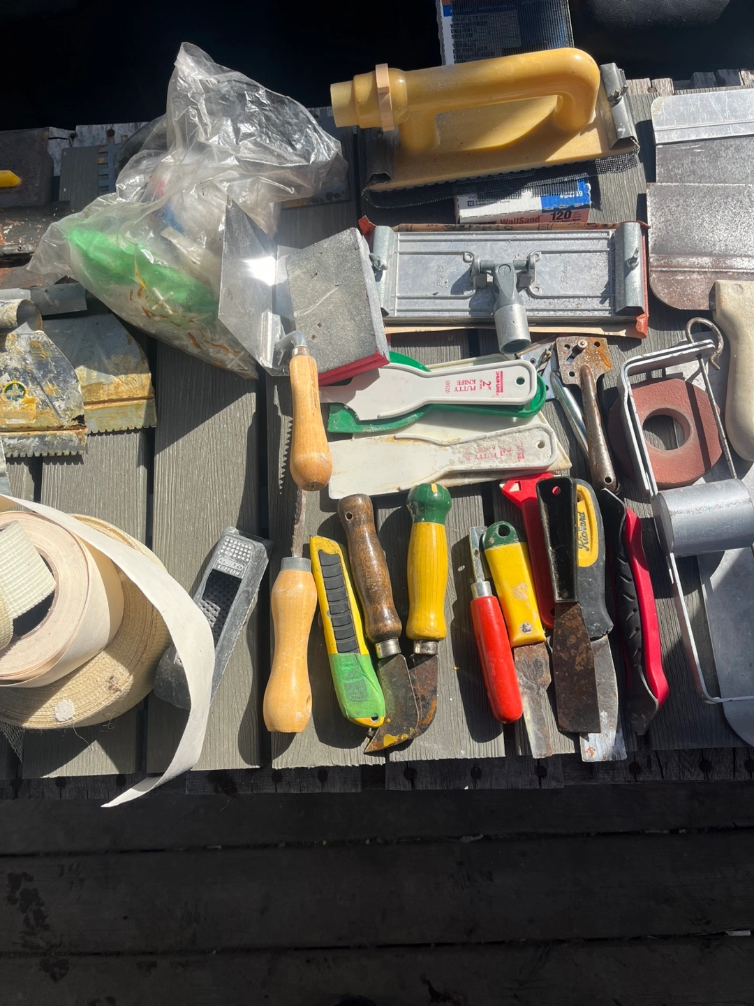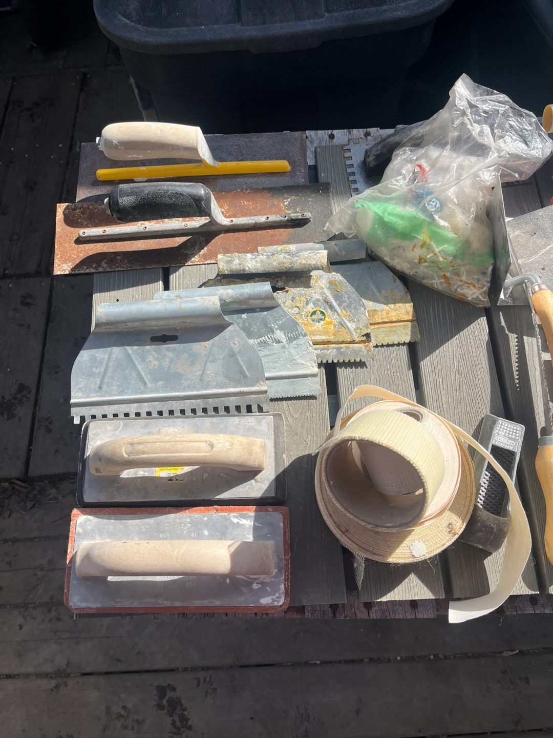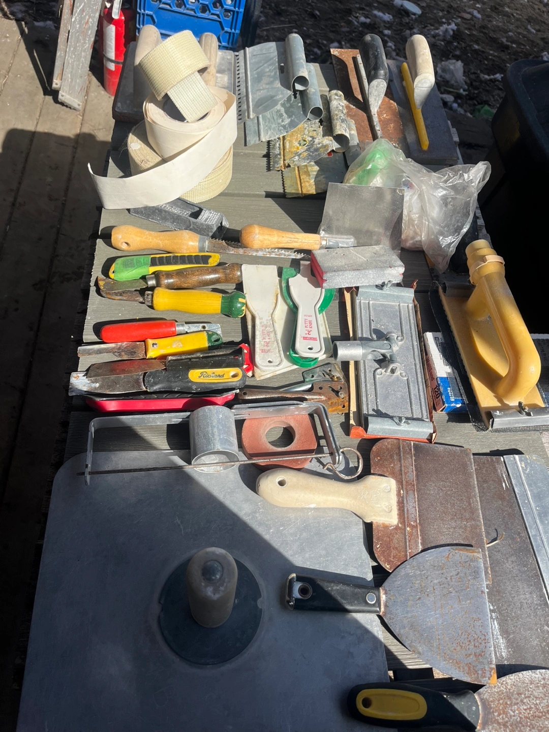 58Assortment of used drywall tools. Includes various sizes of putties, taping knives, sanding tools, and more. Some supplies included. Great for a contractor or DIY enthusiast. $50.00 or best offer.
