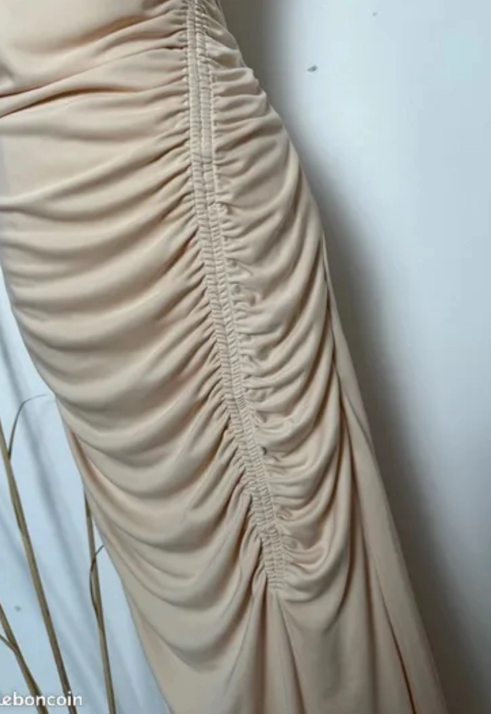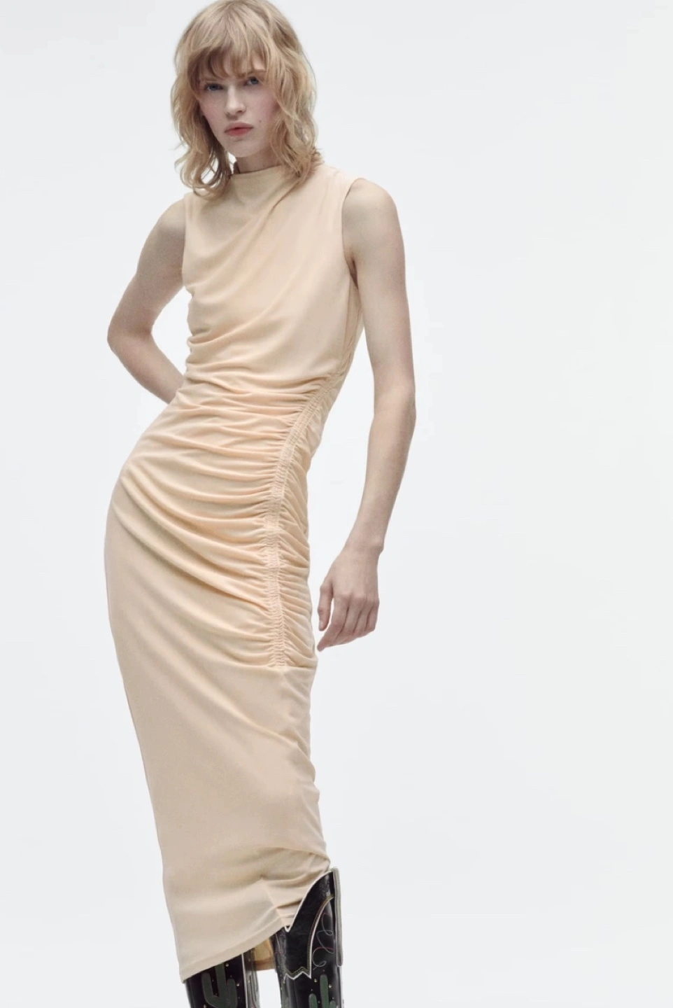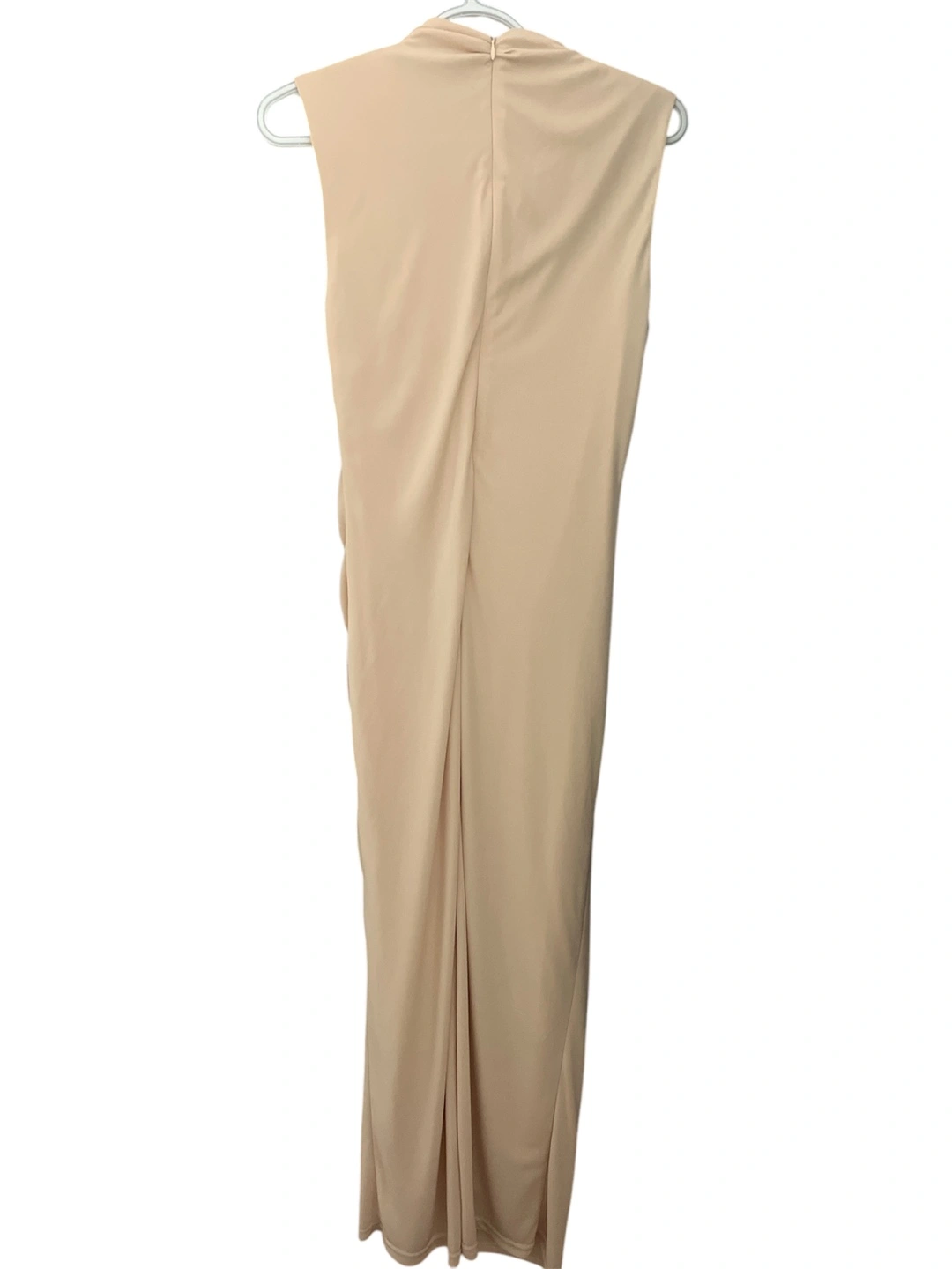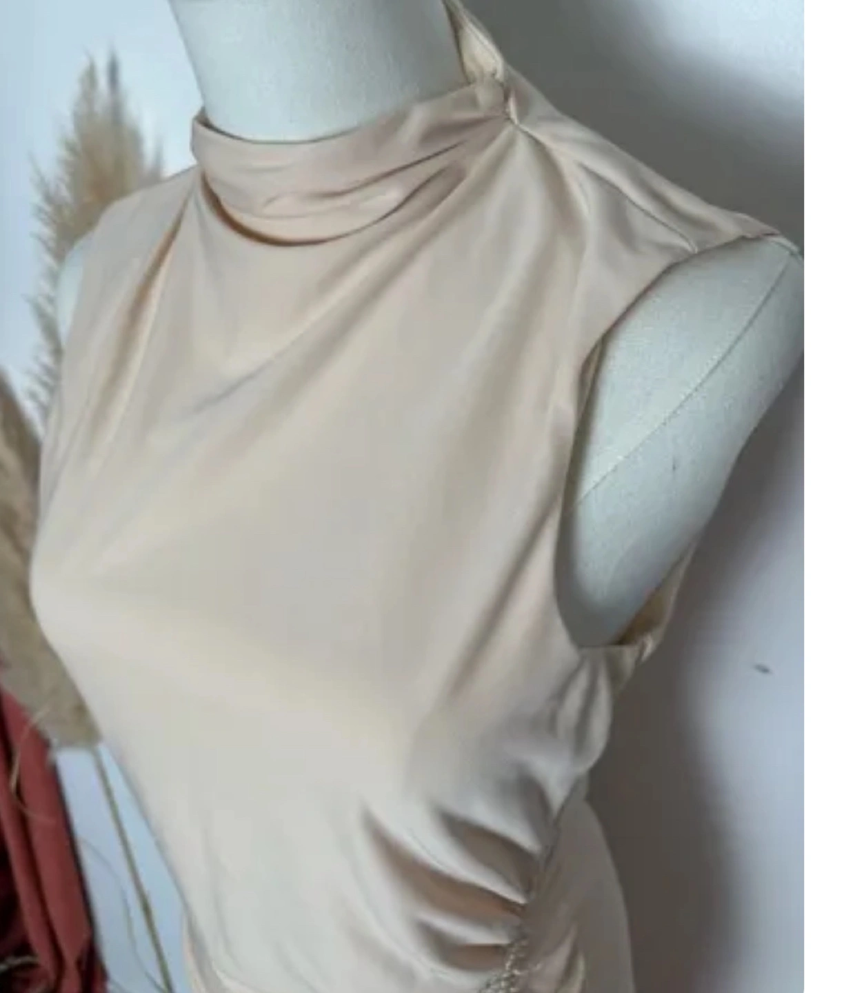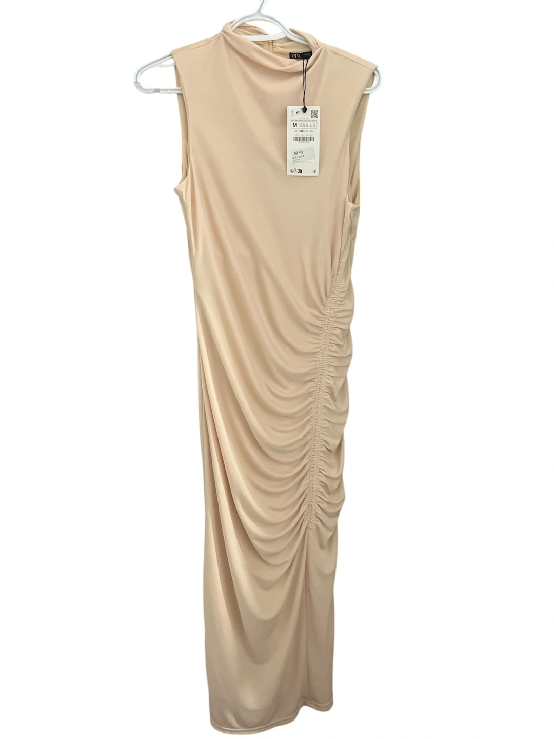New with tags. Elegant midi dress. Features ruched detailing and a mock neck. Sleeveless. Neutral beige colour. Perfect for any occasion.