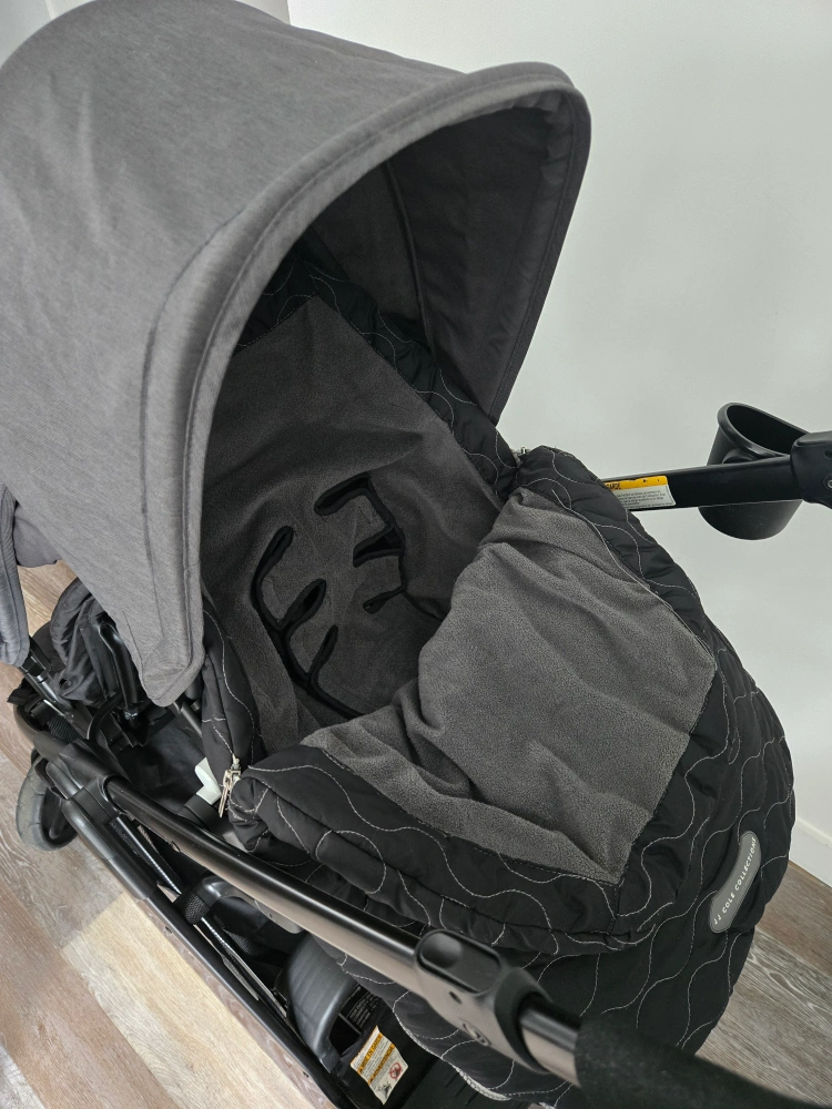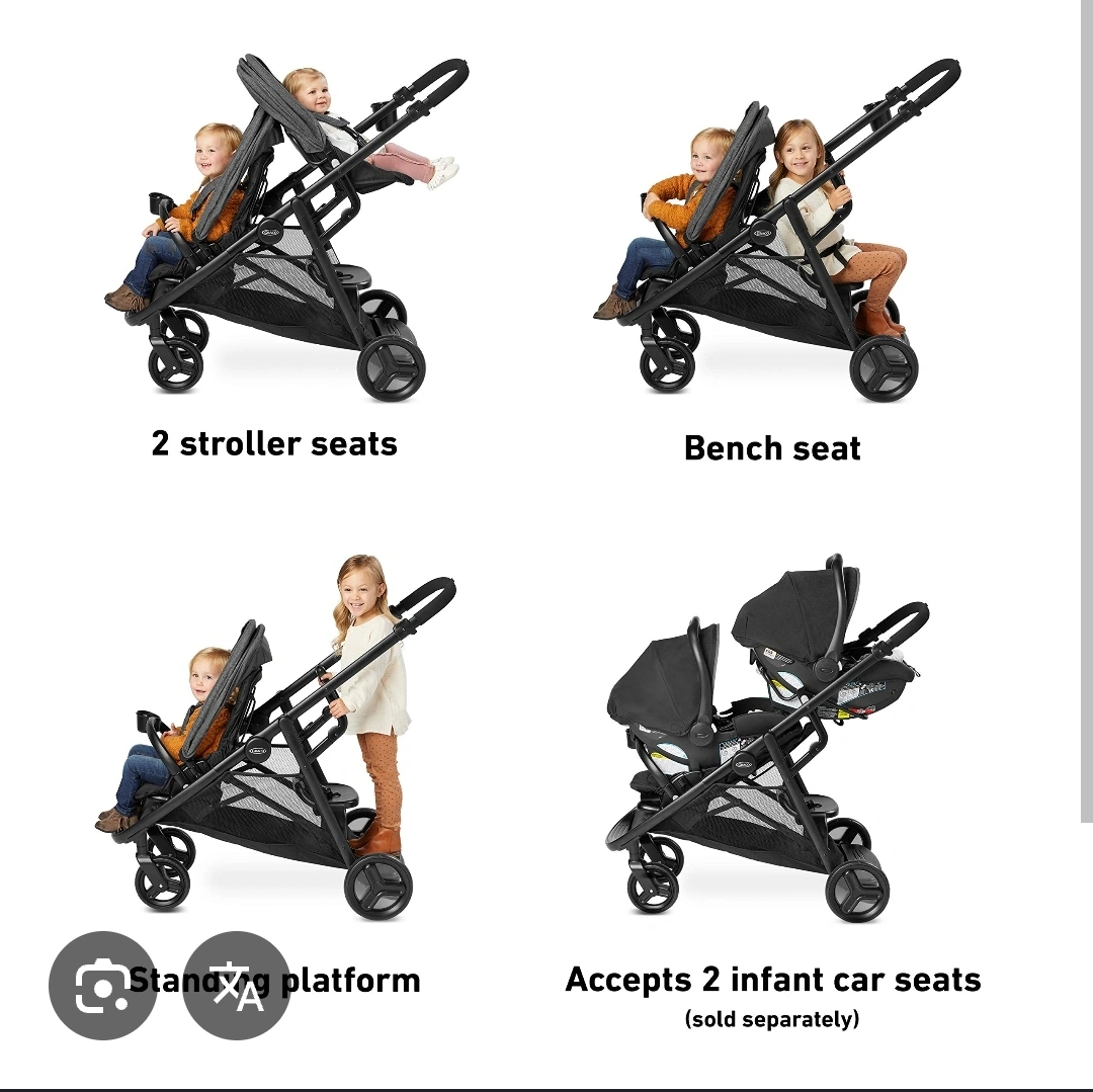 Great double stroller, versatile design. Two stroller seats, bench seat, or standing platform configurations. With winter cover.