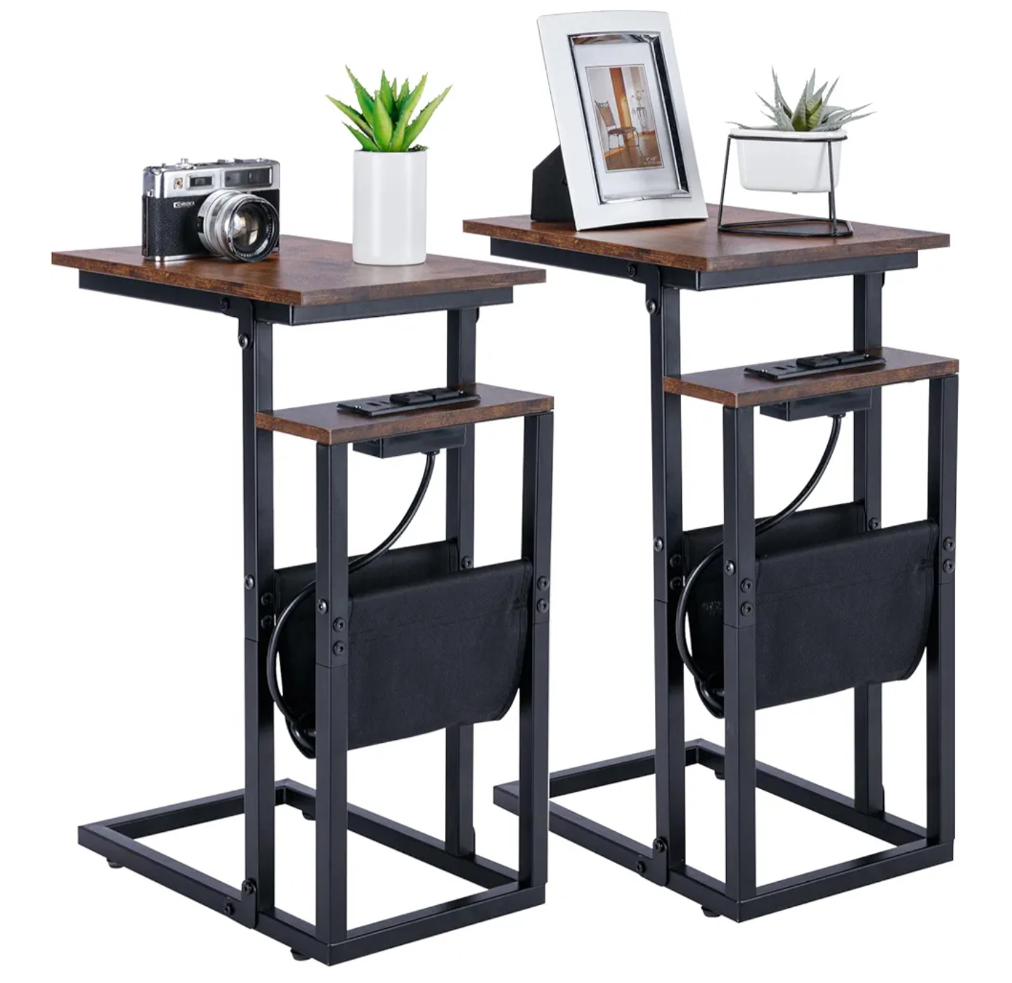 Two matching rustic brown wood and black metal end tables. C-shape design. Features a lower shelf with built-in power strip. Includes fabric magazine holder.