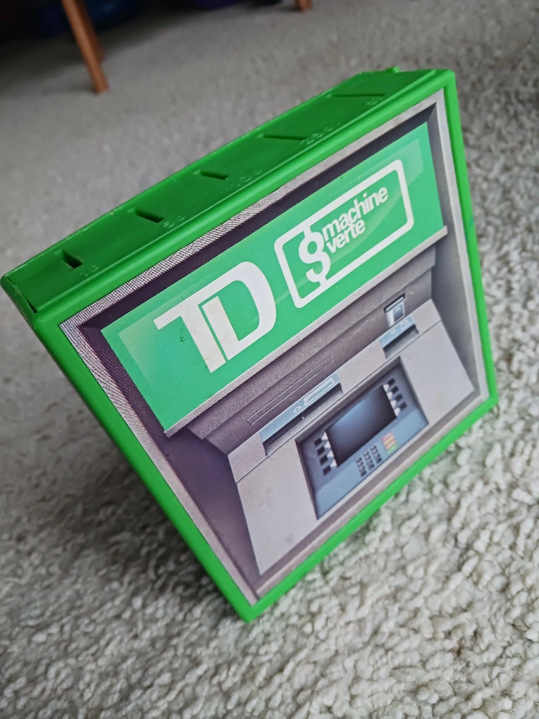 Vintage TD Bank green plastic Piggy bank. Coin slots on top. Never used and clean. Great for kids or collectors. Size: 13.5cm x 13.5cm x 4cm
