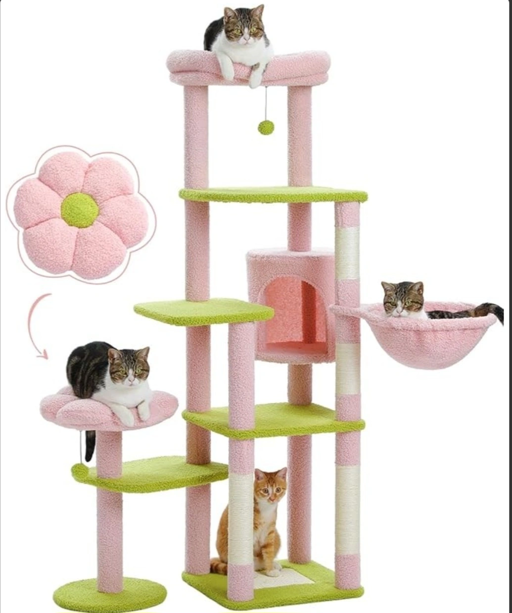Pink and Green Cat Tree with Flower-Shaped Platforms