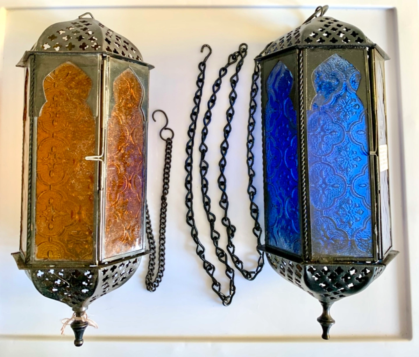 New, never used! Two Moroccan Tealight decorative hanging lanterns. Metal frames with coloured glass panels. Includes chains for hanging. Does not include Tea-lights.