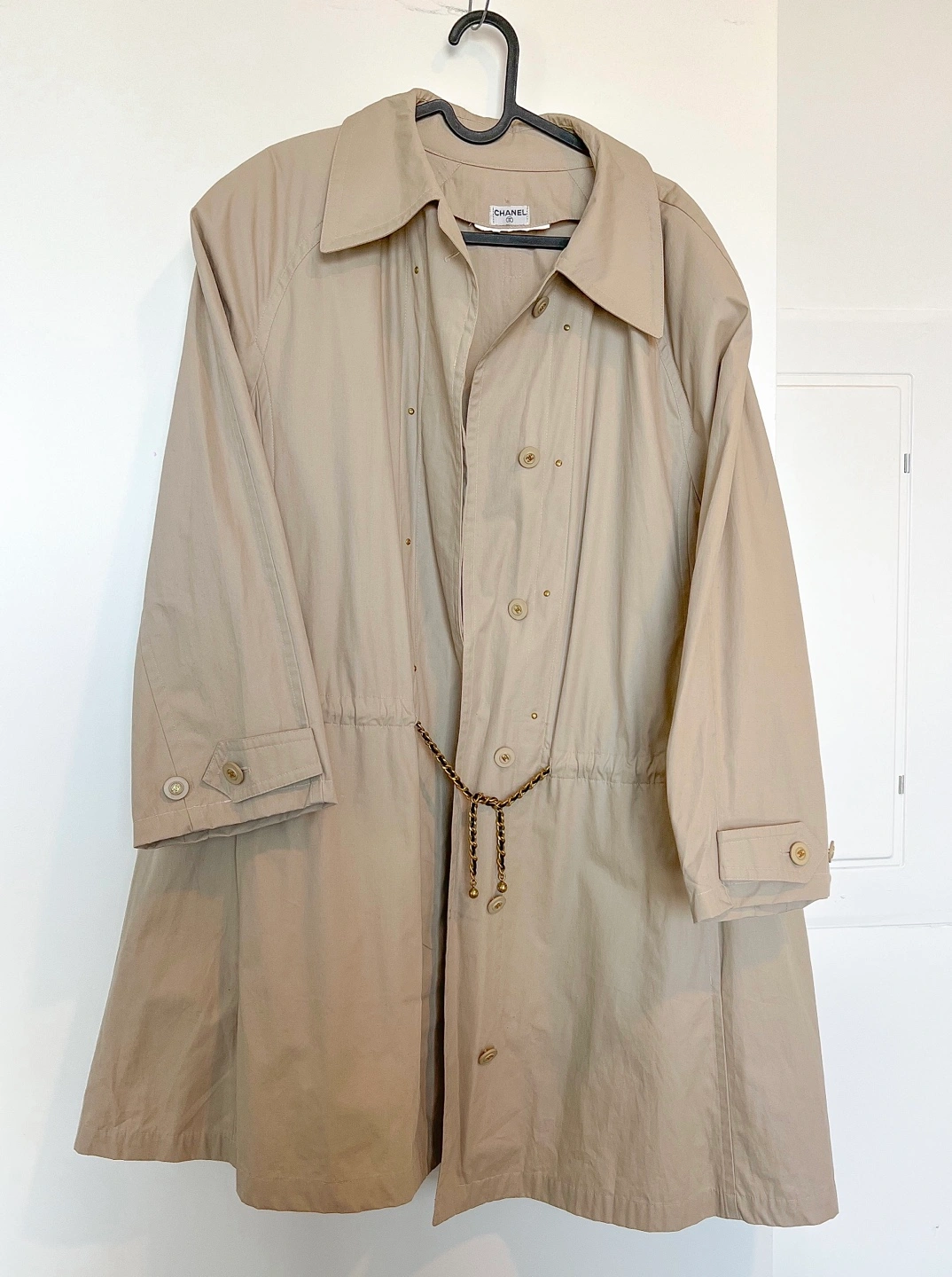 53Very Rare CHANEL vintage (1994) trench coat in excellent condition. All details Chanel present. Oversize fit with adjustment on the belt. Material - 100% cotton Size S/M Will be happy to provide all measurements upon request📏 Design: • Double-breasted front with button closures • Adjustable sleeve cuffs with buttoned tabs • A gathered waist with a signature Chanel chain drawstring for a sophisticated silhouette • A-line shape with a flared bottom for a feminine touch • Rear pleating for added structure and movement • Classic pointed collar Gorgeous vintage trench coat in beige colour.Excellent condition, no defects! The price is negotiable. We can meet anywhere (GTA and Toronto), and shipping is available📦 (FREE!) You can try them on before buying :) Msg me for more details. Check out my other listings♥️ thanks.
