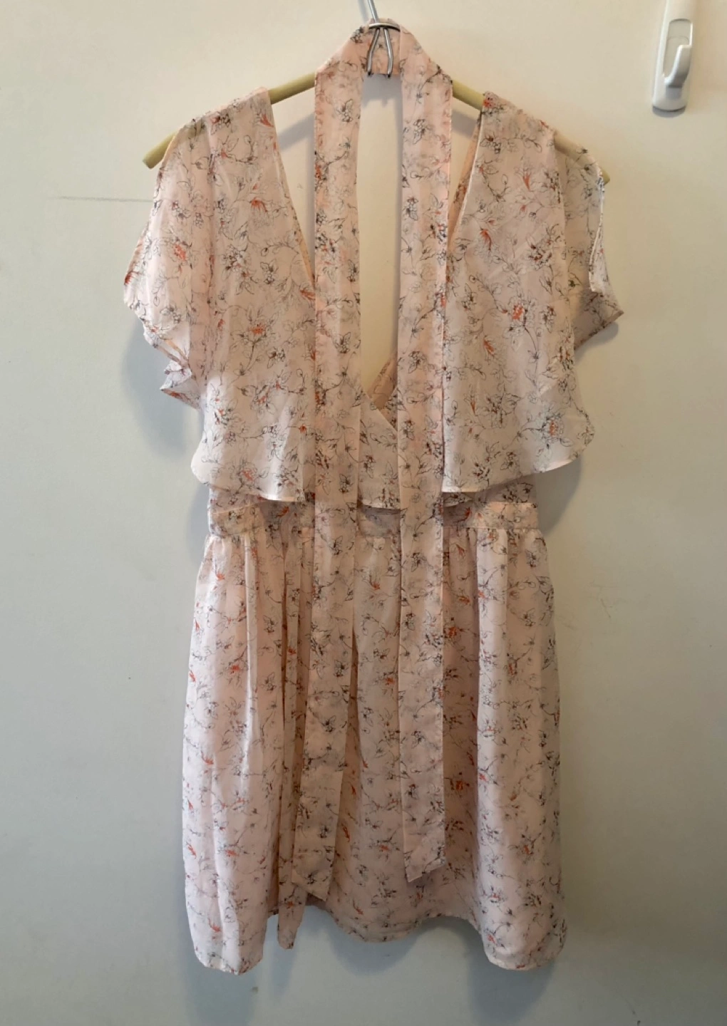 Adorable floral mini dress. Features flutter sleeves, a V-neck front and back. Lightweight and flowy fabric. Perfect for spring and summer.