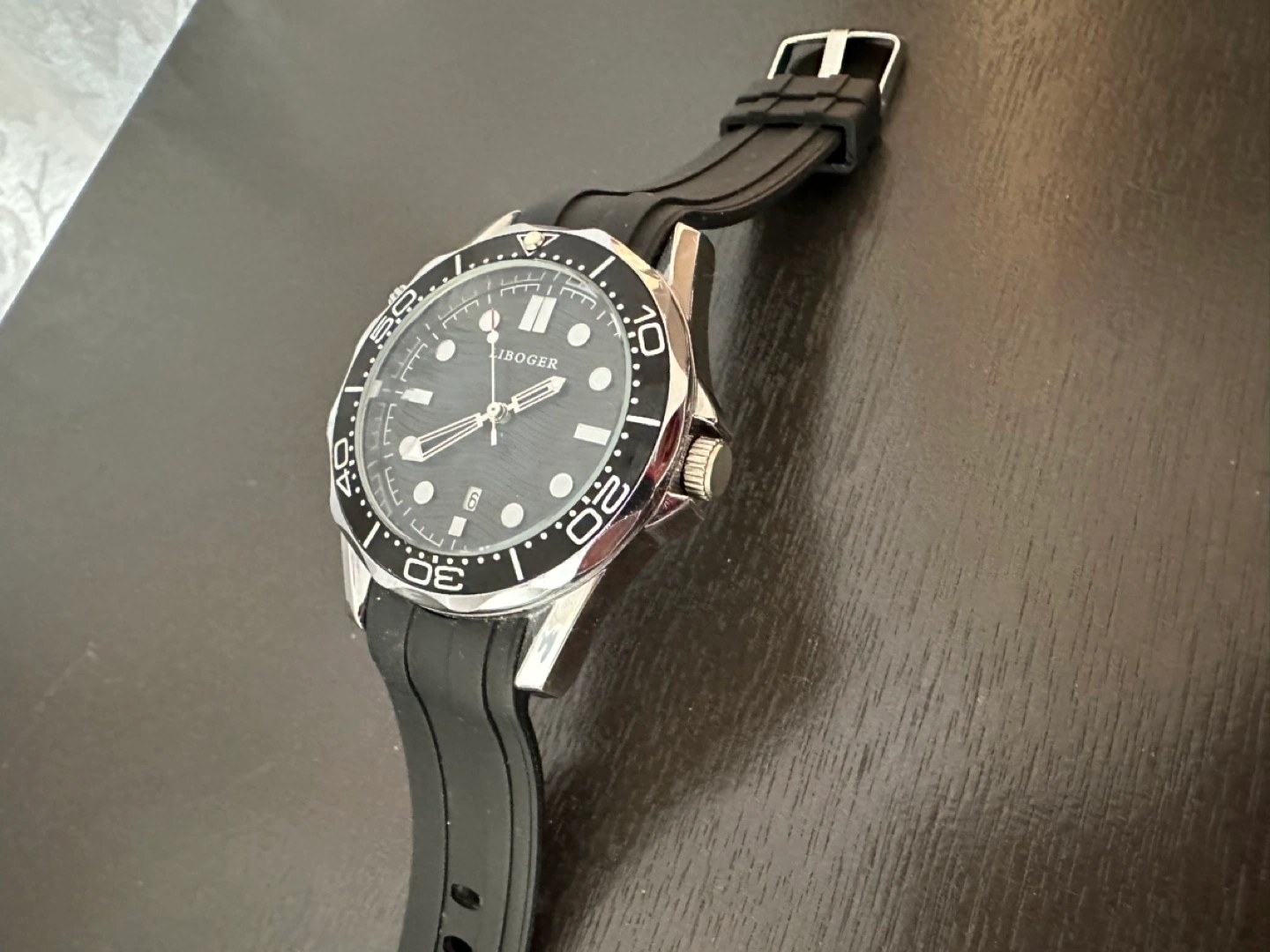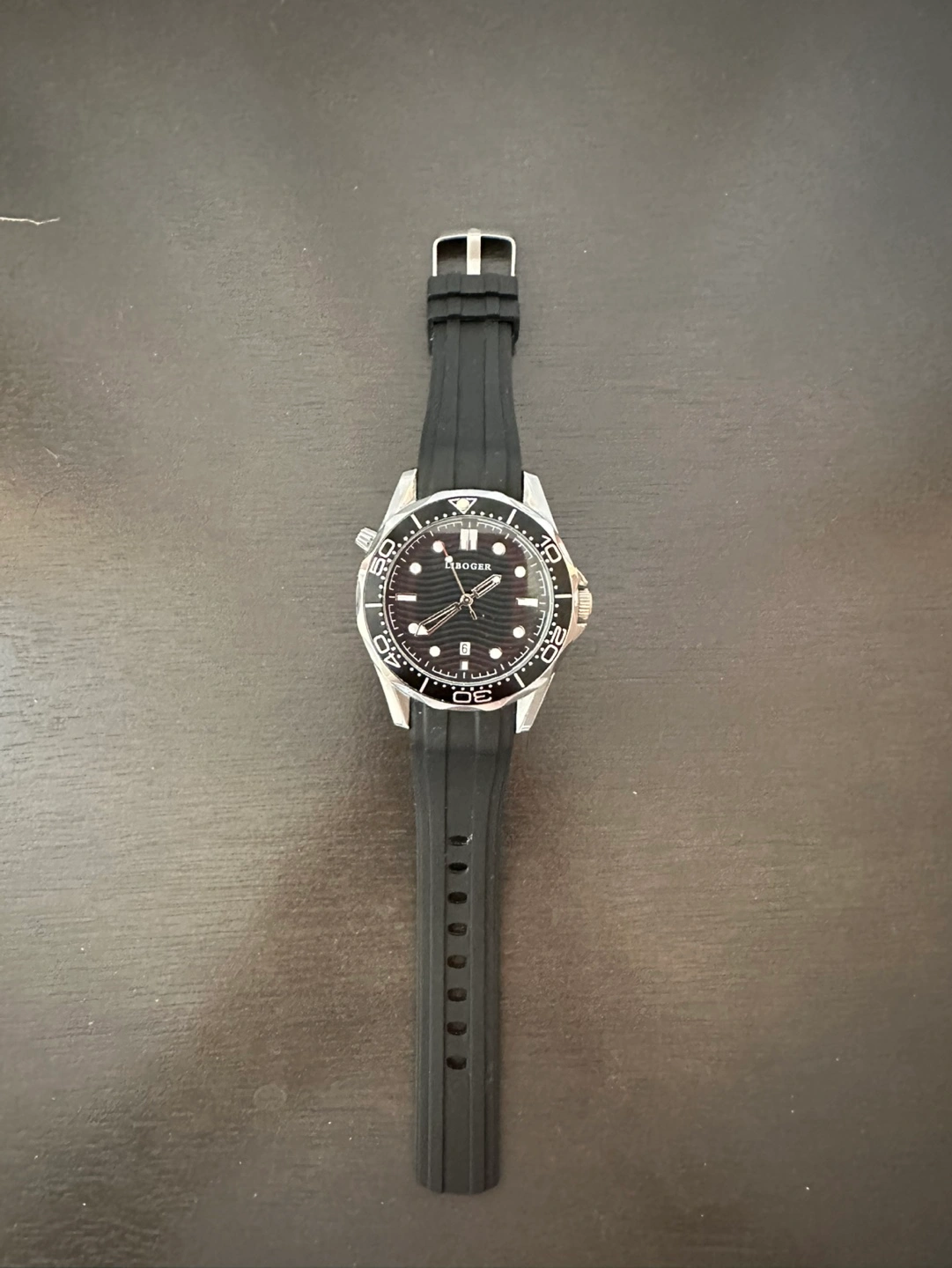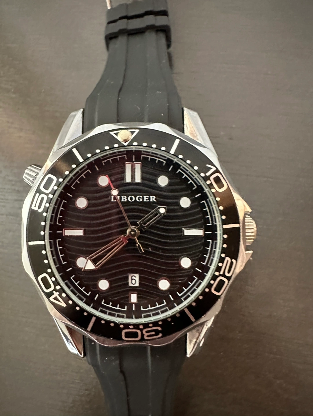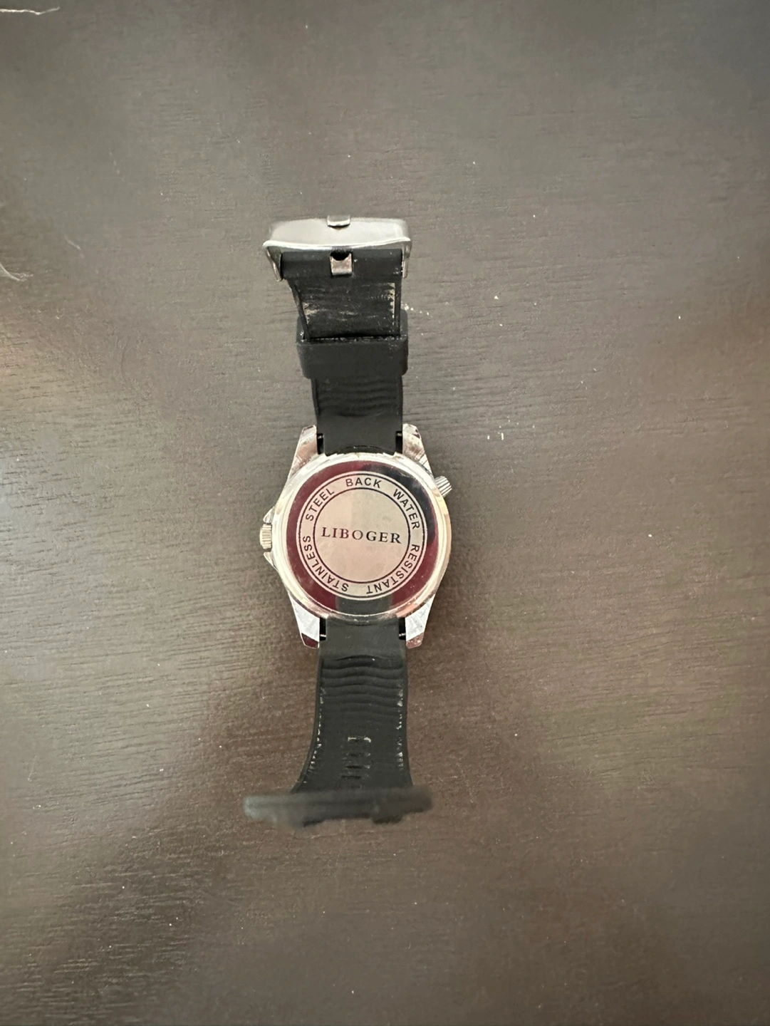 Men's Liboger wristwatch. Black dial. Date, silver casing. Rubber band. Looks sporty and keeps good time. Clean and no issues. Pick up near Scarborough Town Centre. The knob at the top left is cosmetic and has no function.